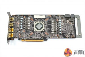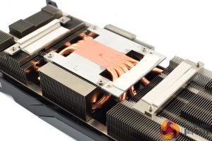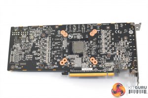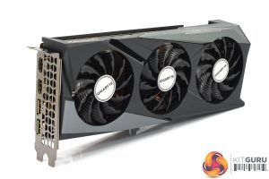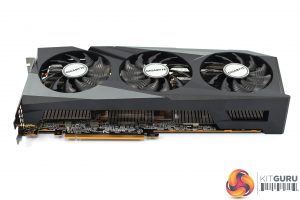 In terms of the fans, Gigabyte uses three 80mm fans, and as with all of its graphics card designs from the last couple of years, the central fan spins in reverse relative to the outer two, which Gigabyte claims helps to reduce airflow turbulence from the fans.