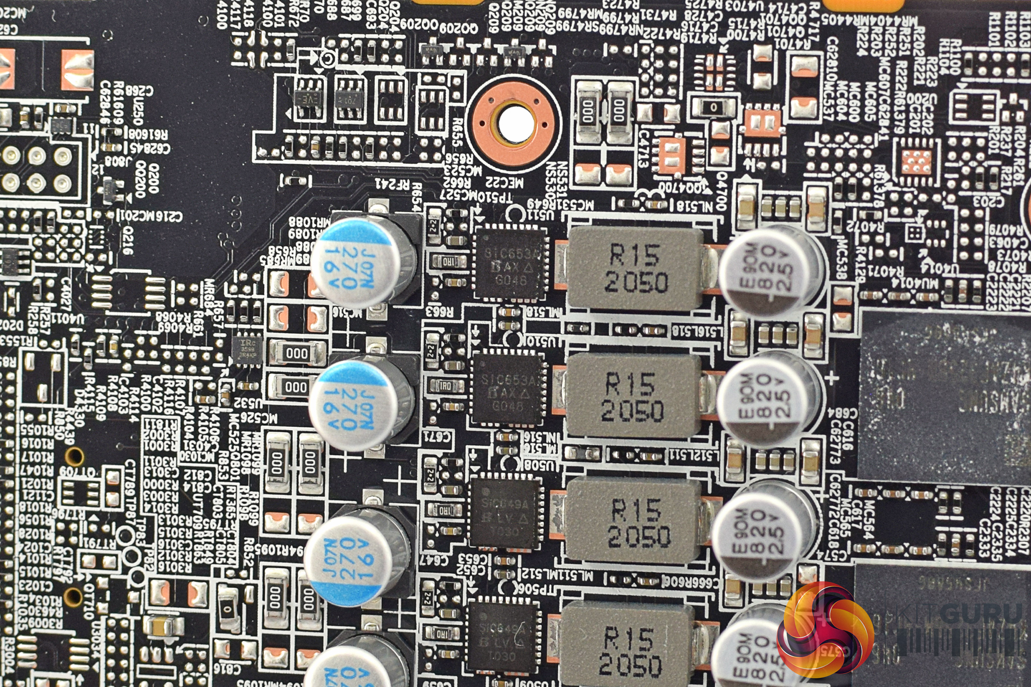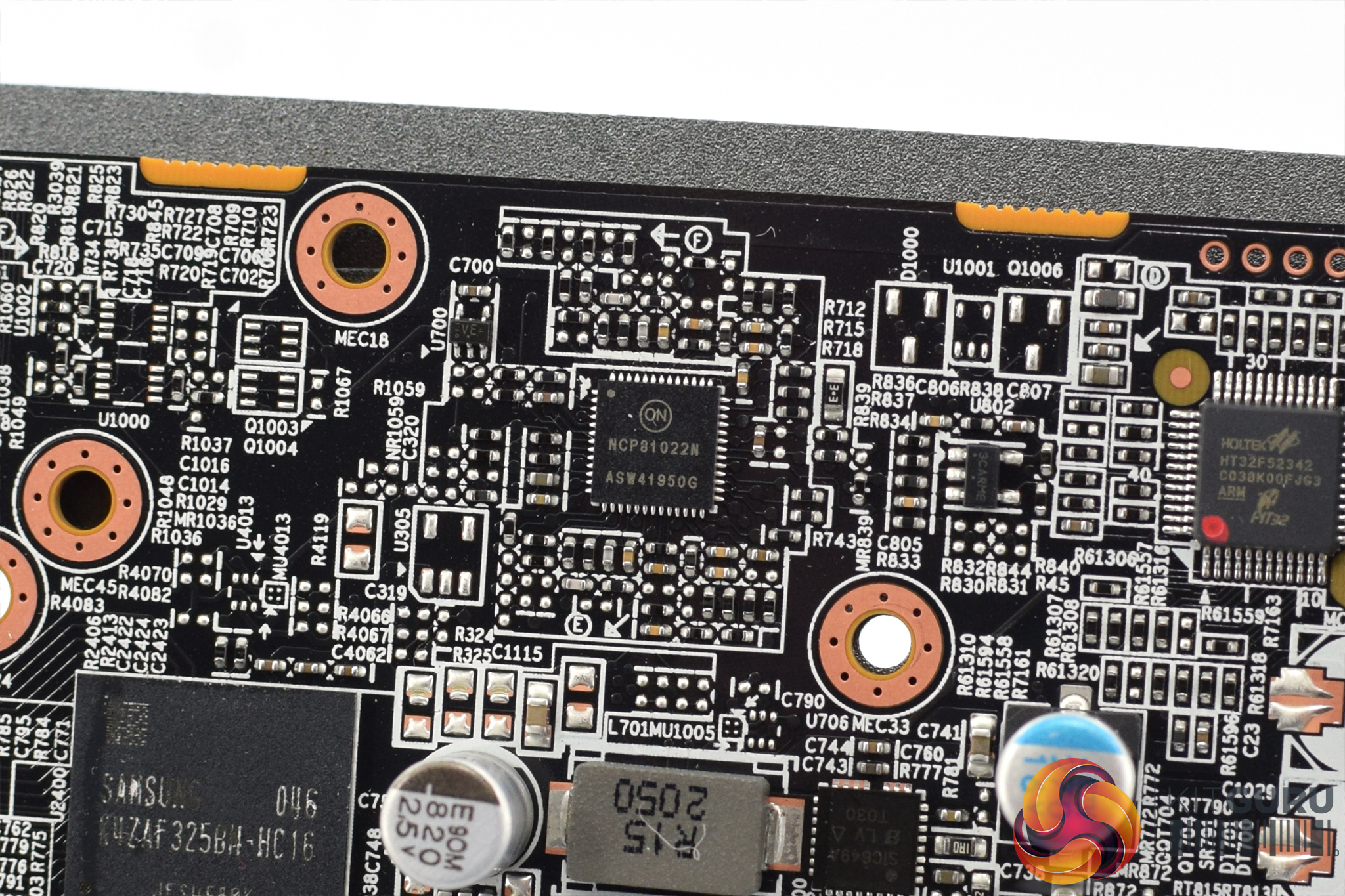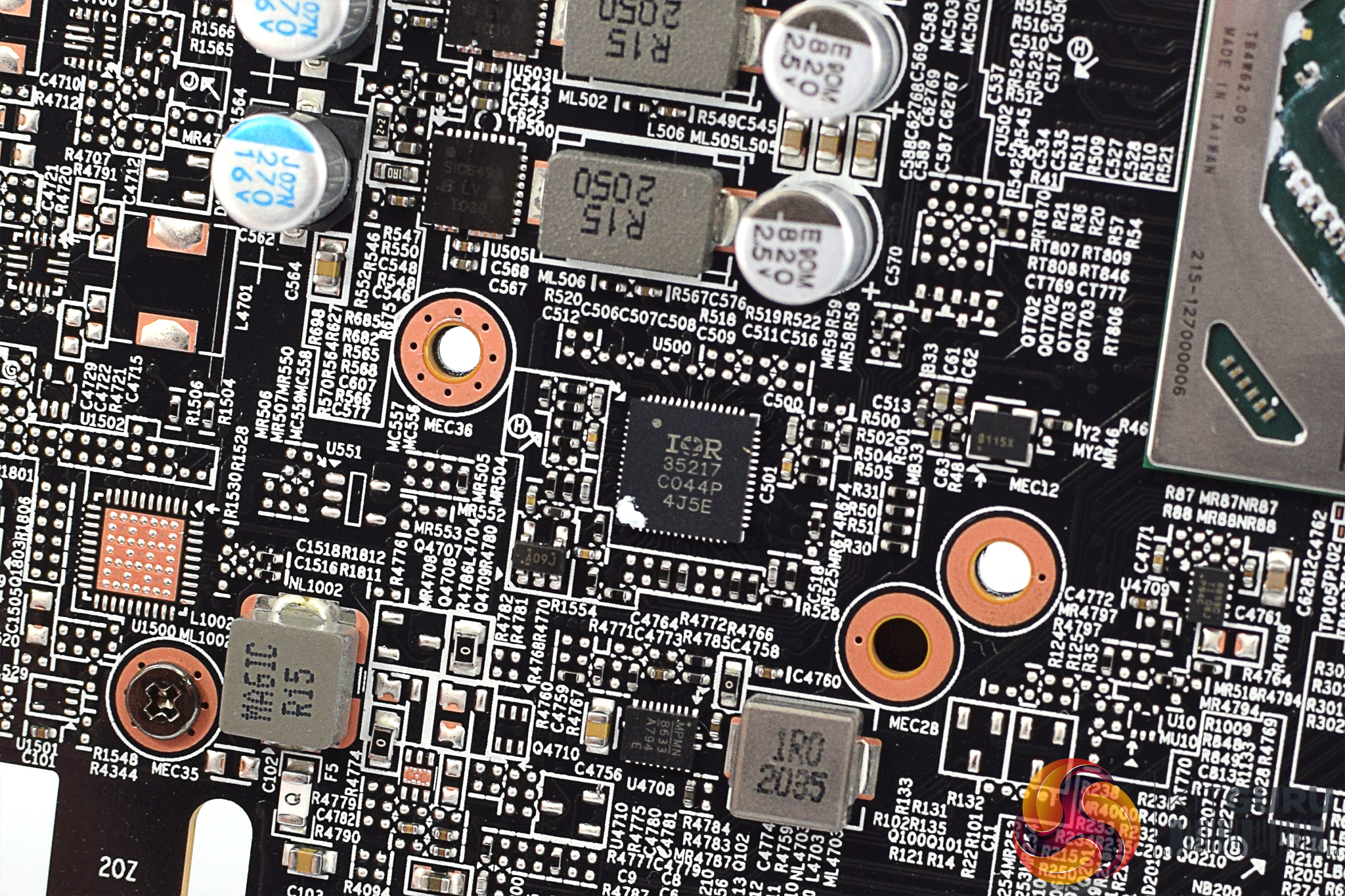 Upon disassembly of the card, we get a good look at the PCB. Gigabyte is using what appears to be a very similar design to the reference card, with an 11-phase power solution that's split with 9 phases for the GPU and 2 phases for the memory. The GPU VRM is controlled by International Rectifier’s IR35217, while the memory controller used is OnSemi’s NCP81022N. Vishay SIC653A and SIC649A MOSFETs are used throughout.