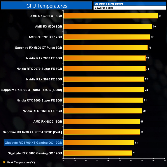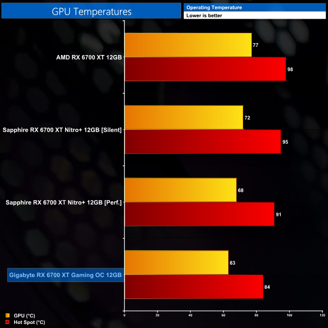 For out of the box thermal performance, the Gaming OC does the best of any RX 6700 XT we have tested so far. The GPU edge temperature peaked at 63C, with the junction at 84C, both several degrees cooler than the Sapphire Nitro+ when using its Performance BIOS.