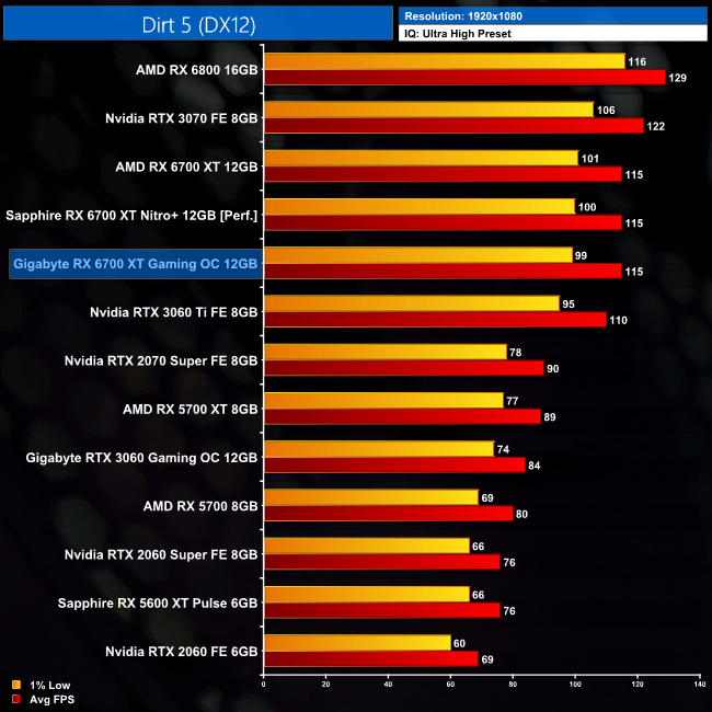 Dirt 5 shows a touch more variation in performance than the other titles we have looked at so far, but at 1440p there's still just a 2FPS gap between all three RX 6700 XTs on test.