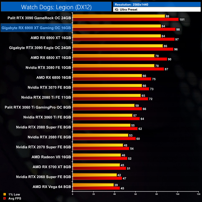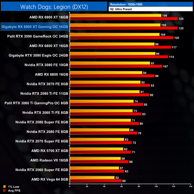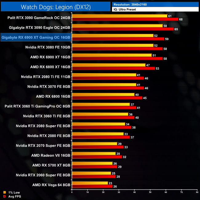 Lastly, we come to Watch Dogs: Legion. At 4K, we are looking at a difference of a single frame, making the Gigabyte Gaming OC 2% faster than AMD's reference board.