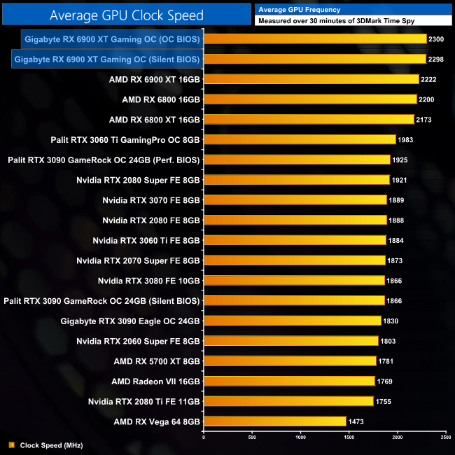 Here we present the average clock speed for each graphics card while running the 3DMark Time Spy stress test for 30 minutes. We use GPU-Z to record the GPU core frequency during the Time Spy runs. We calculate the average core frequency during the 30 minute run to present here.
