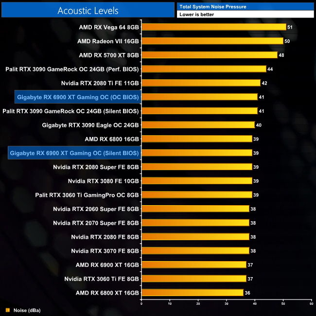 We take our noise measurements with the sound meter positioned 1 foot from the graphics card. I measured the noise floor to be 32 dBA, thus anything above this level can be attributed to the graphics cards. The power supply is passive for the entire power output range we tested all graphics cards in, while all CPU and system fans were disabled. A reading under load comes from running the 3DMark Time Spy stress test for 30 minutes.