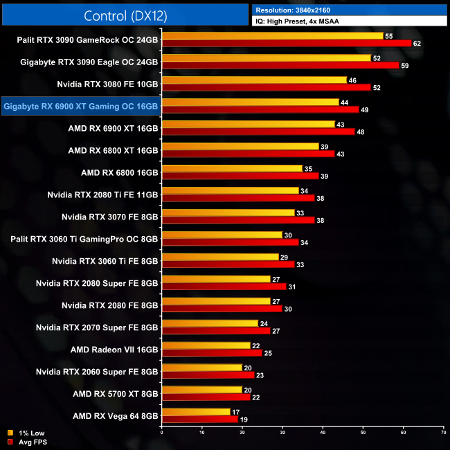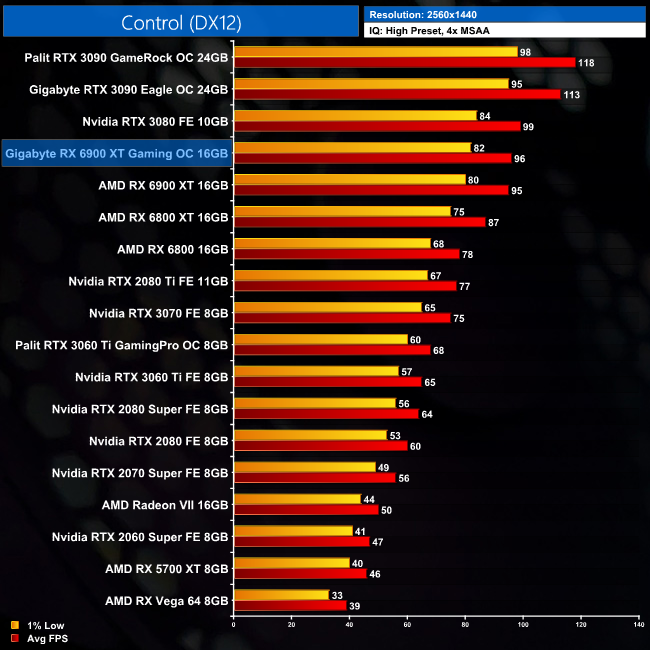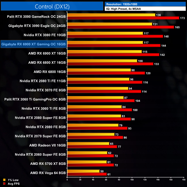 For the gaming benchmarks, we start with Remedy's Control. Here, the Gigabyte Gaming OC came in 1% faster than the reference 6900 XT at 1080p and 1440p. Up at 4K, the Gaming OC proved 2% faster, a difference of a single frame.