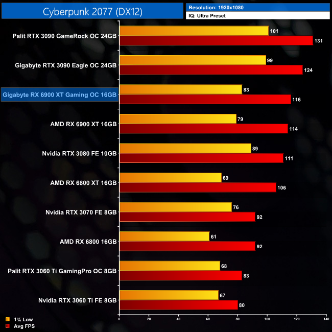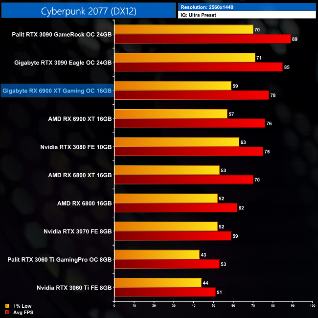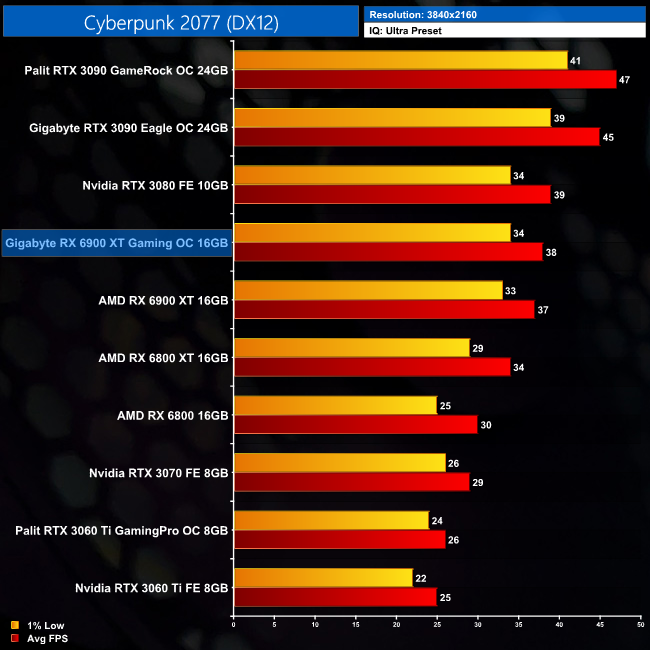 As for Cyberpunk 2077, the Gaming OC is still just a single frame faster than the reference card when testing at 4K. As the frame rate is pretty low however, that single frame works out as a difference of 3%.