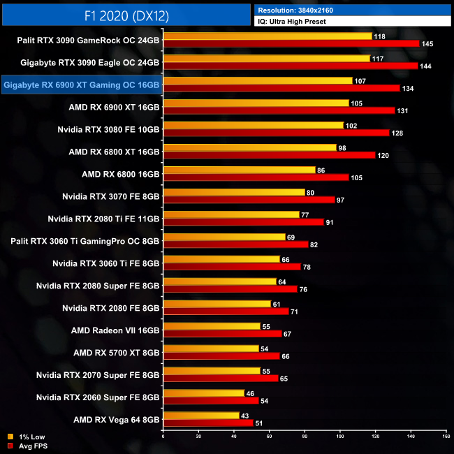 Next up is F1 2020. The 6900 XT pushes over 130FPS at 4K in this title, but it is still 2% faster than the AMD reference card.
