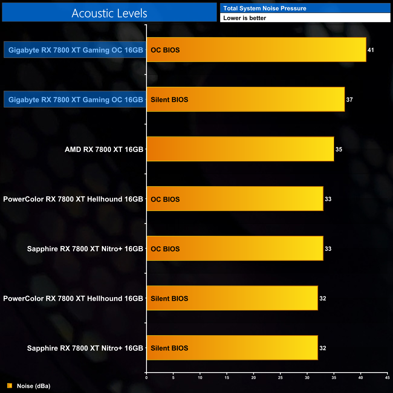 Those out of the box thermal results don't take noise levels into the equation however, and the Gaming OC is the loudest of the 7800 XT's we've tested – including AMD's reference design. The OC BIOS hit 41dBa, with the fans spinning at 41%/1740rpm, while the Silent BIOS is quieter as its fans targeted 30%/1200rpm speeds. 41dBa is definitely a bit louder than I'd like, and is getting to the point where you would hear the GPU over your case fans. Even using the Silent BIOS it isn't as whisper-quiet as the likes of the Nitro+ or PowerColor Hellhound.