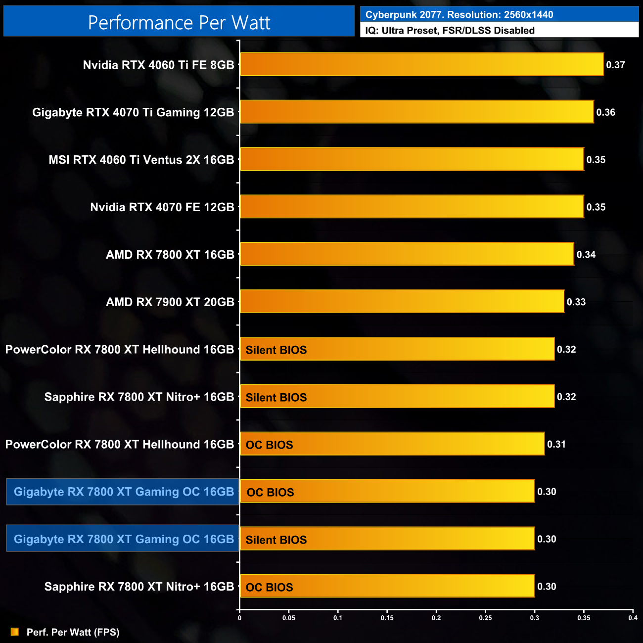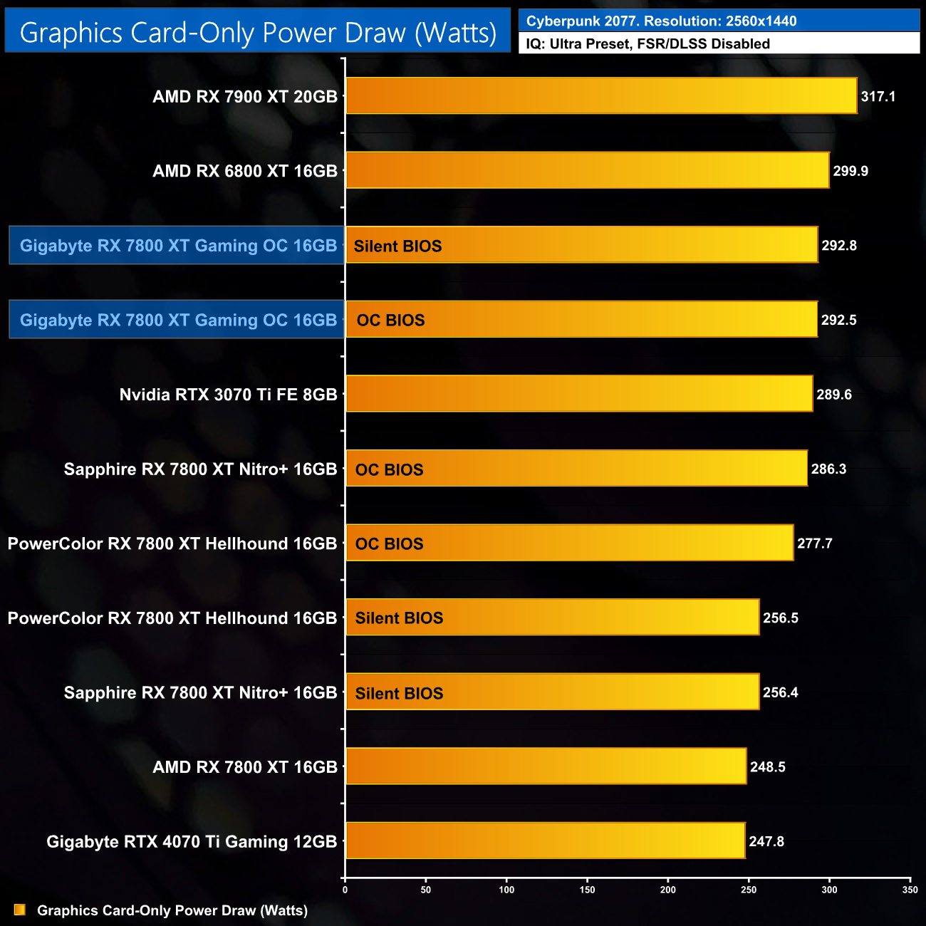 We can see that higher power target in play here in Cyberpunk 2077 – both the OC and Silent BIOS share the same power target and both draw about 293W under load. That's more than even the Sapphire Nitro+, and almost 50W more than the reference AMD card.
