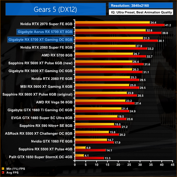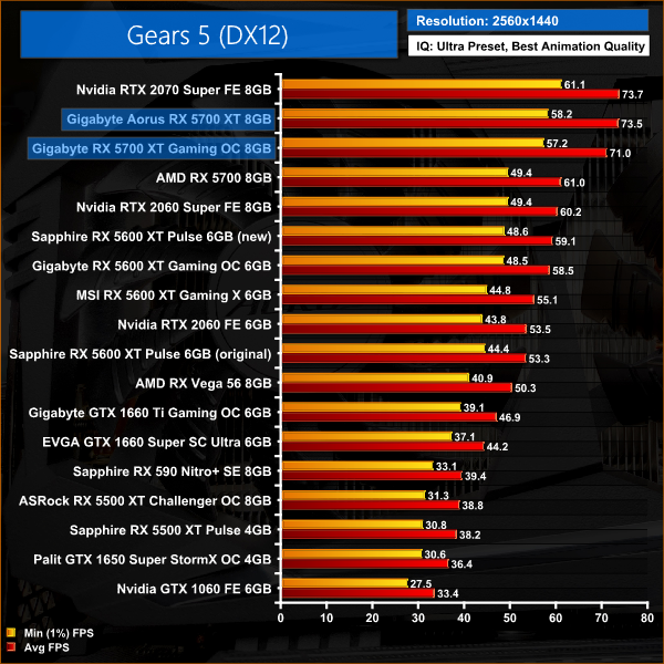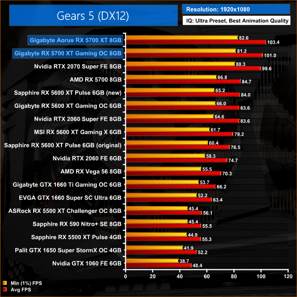 As we have seen in a couple of other titles so far, the difference between our two RX 5700 XTs isn't huge when gaming at 1080p in Gears 5 – there's just a 2% gap between the Aorus and Gaming OC cards.