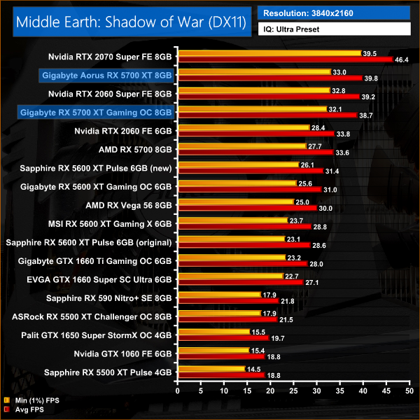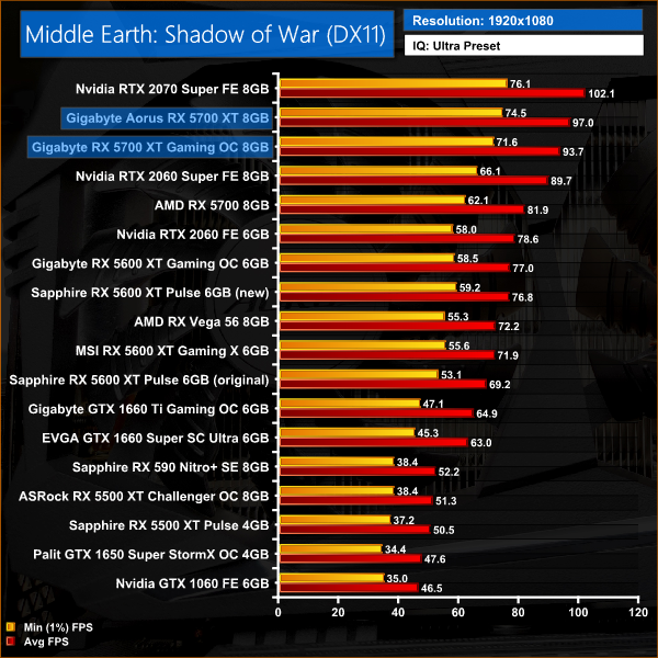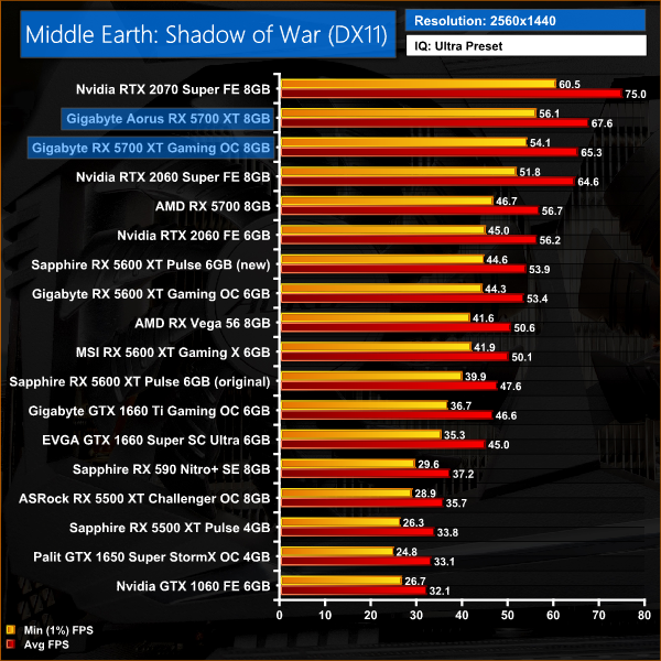 Despite the Aorus RX 5700 XT coming in 4% faster than the Gaming OC at both 1080p and 1440p resolution, it isn't enough to close the gap on the RTX 2070 Super in Middle Earth : Shadow of War. The Aorus 5700 XT is 10% slower at 1440p, while the Gaming OC is further behind, with a 13% performance deficit.