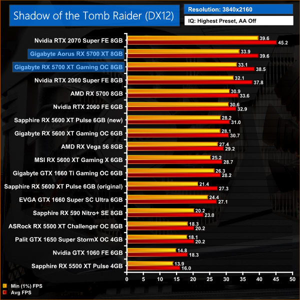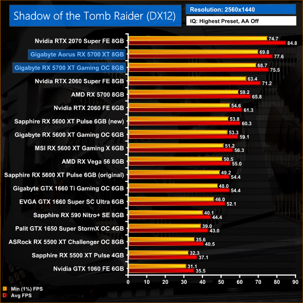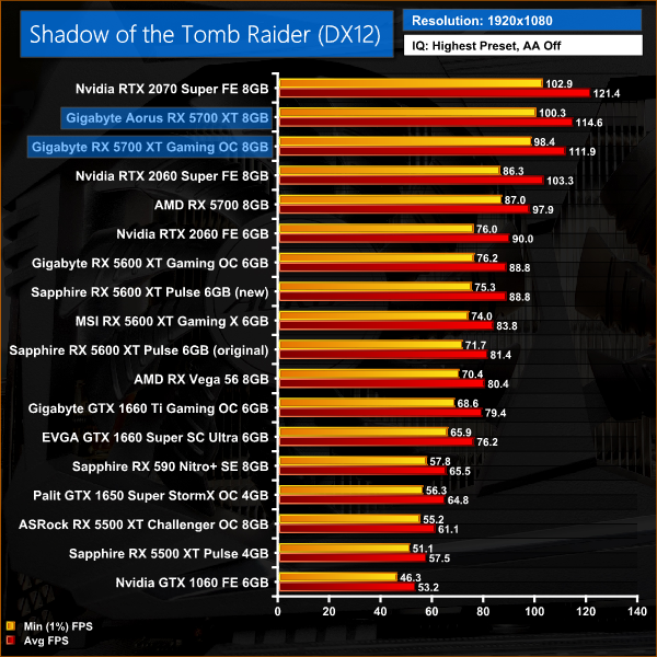 In Shadow of the Tomb Raider, we can again see both RX 5700 XTs fall behind the 2070 Super. That said, the increased clock speed for the Aorus card helps it close the gap on the Nvidia card – it's just 8% slower at 1440p, compared to the Gaming OC which is 11% slower at that same resolution.