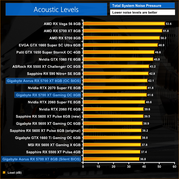 As for the Gaming OC, it's a little quieter than the Aorus using the OC profile, but not by much, with its three fans spinning at 41% under load, or around 1740rpm. Again, it's a good result but there are quieter cards out there.