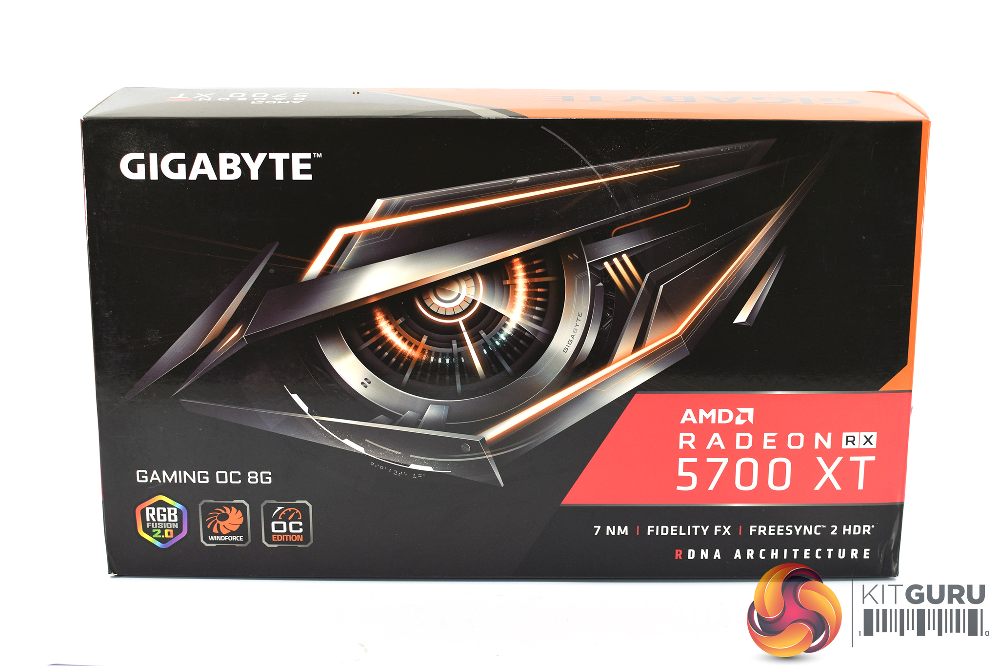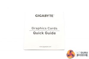 The Gigabyte RX 5700 XT Gaming OC ships in a black box, with Gigabyte's large robotic eye logo dominating the front. Inside, the only included accessory is a small quick start guide.