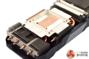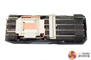 The cooler is again familiar, being the same design as the RX 5600 XT Gaming OC. This means it uses three fin stacks, with a total of 5 copper heatpipes – each pipe measures 6mm. These pipes also make direct contact with the GPU die, but there are separate coldplates for the memory and the VRM.