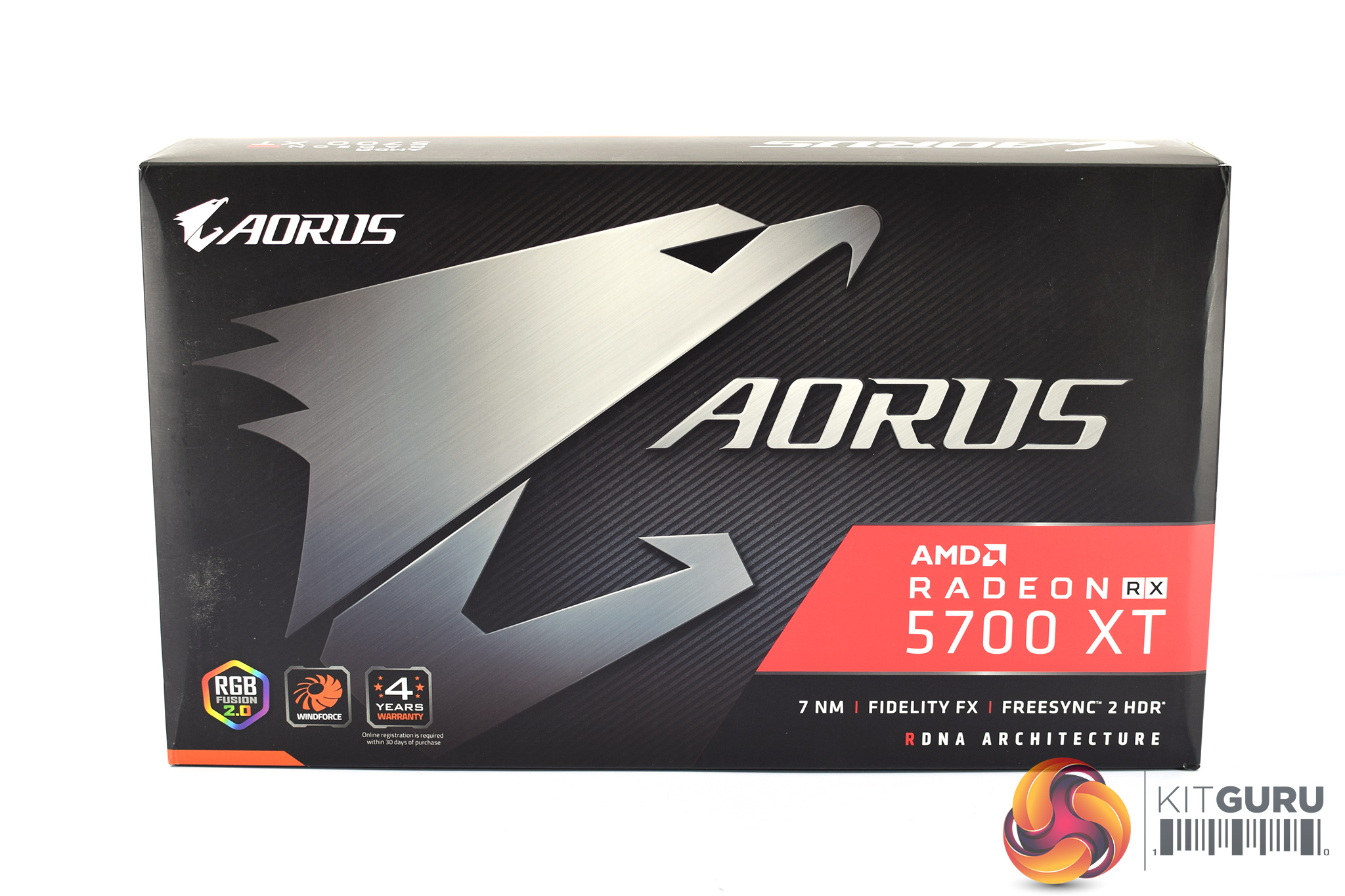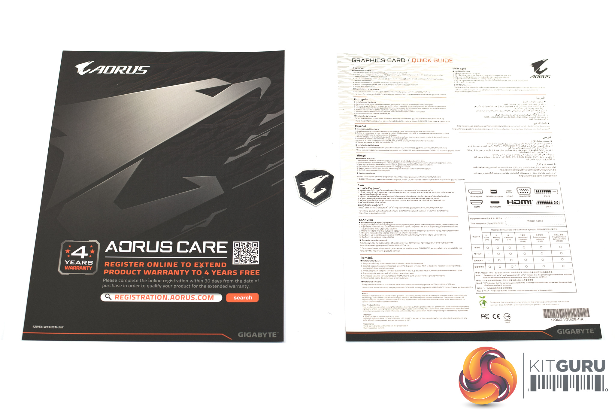 As for the Aorus RX 5700 XT, this again ships in a black box but with the Aorus eagle logo taking pride of place on the front. Inside, the accessory bundle consists of an Aorus care leaflet, a small Aorus sticker/badge, and a multi-lingual quick start guide.