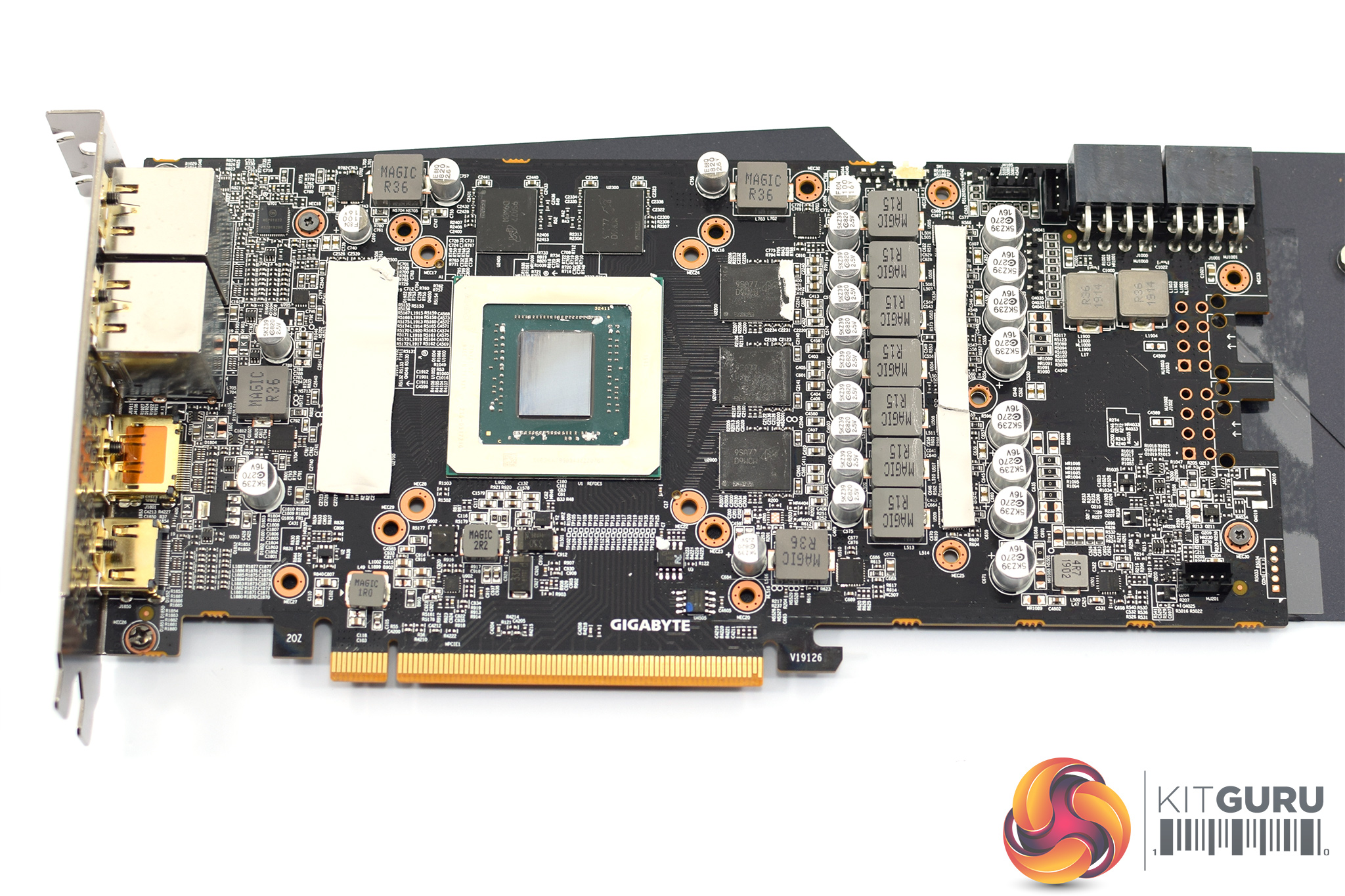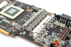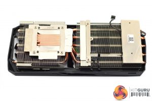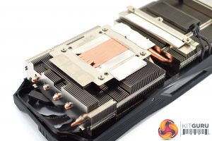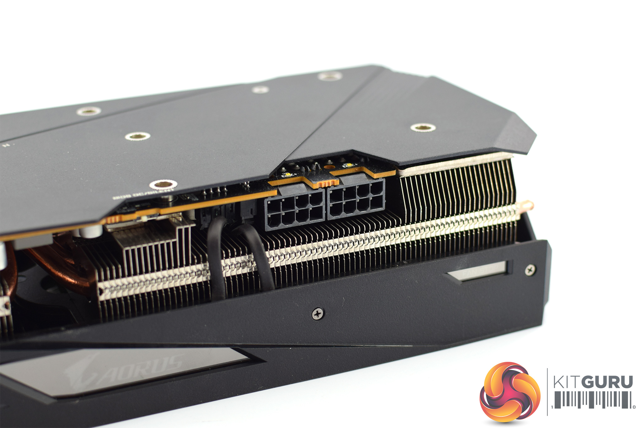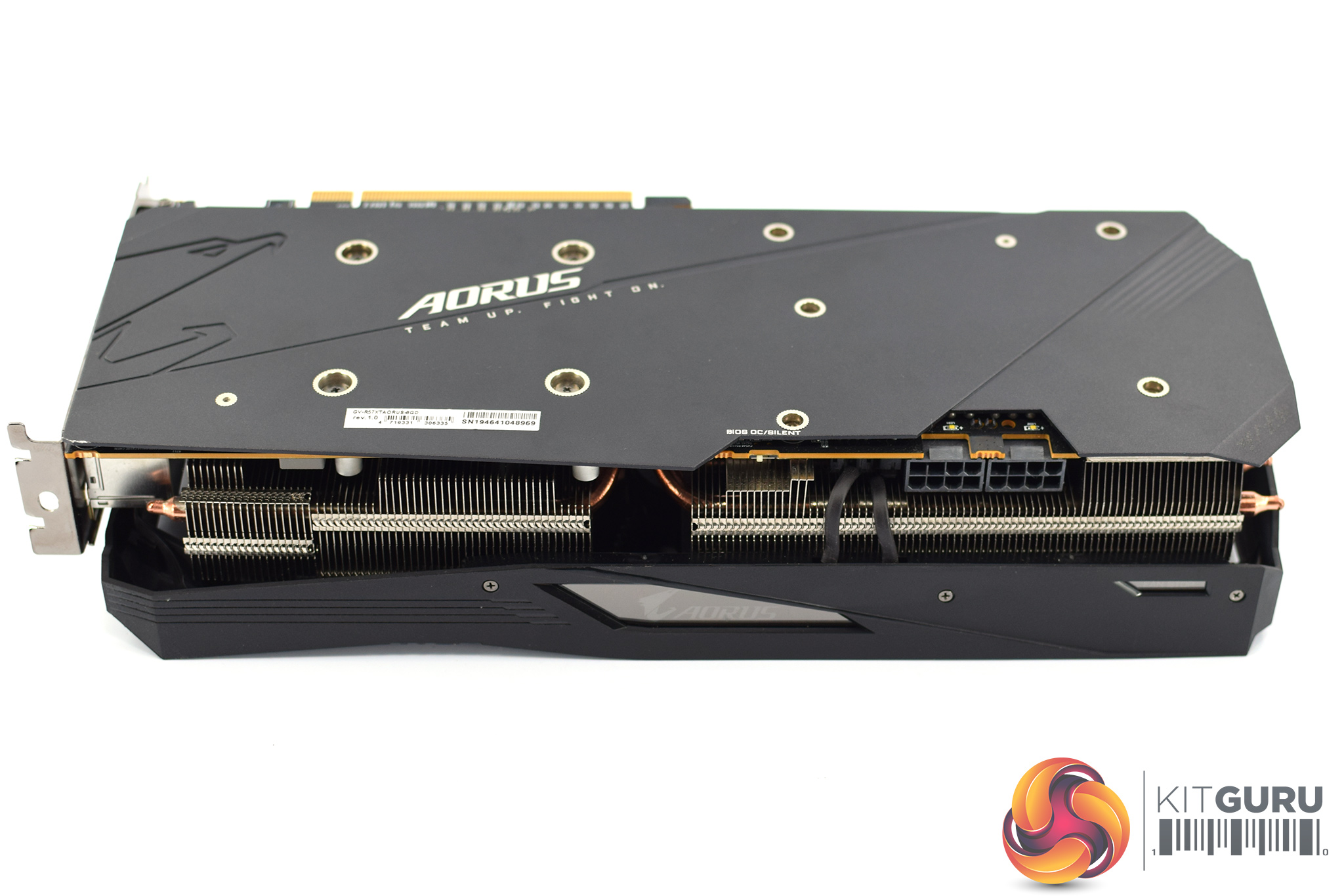 While the PCB may not have changed between the Gaming OC and Aorus cards, the cooler is definitely a step up with the Aorus card. We've already touched on the fact the Aorus model is thicker, with increased mass for its two fin stacks. It also has an extra heatpipe compared to the Gaming OC, for a total of 6x6mm pipes. Once more, both the VRAM and VRM use their own dedicated coldplates.