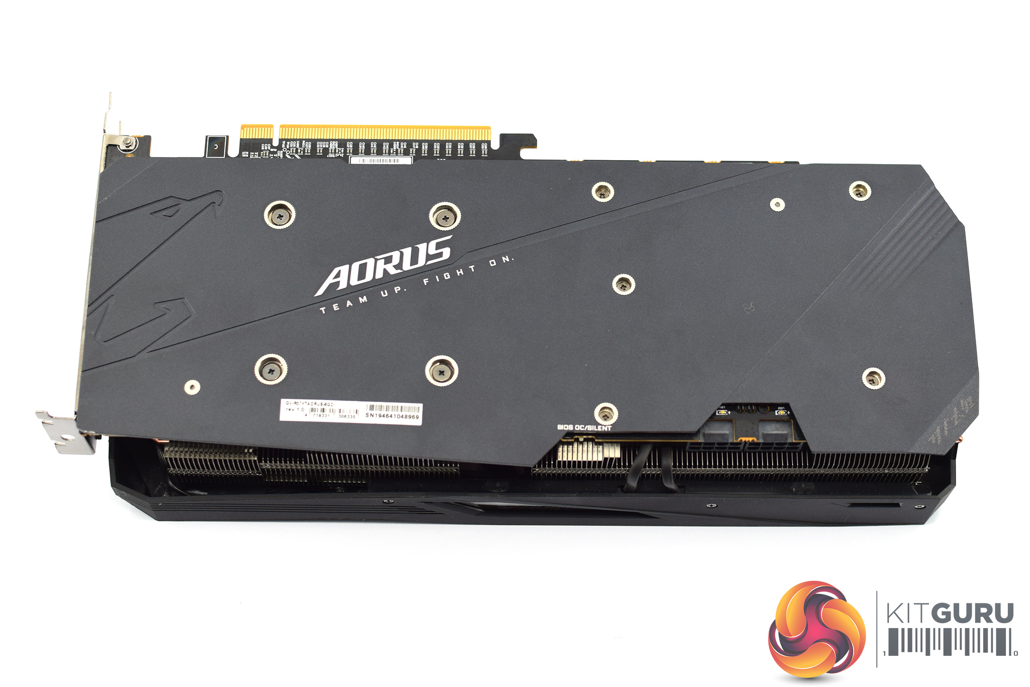 We can also see the full-length metal backplate used here. There is a bit more design flair here, with the Aorus eagle logo cut into the backplate on the left-hand side. We can also see the words ‘team up. fight on' printed under some Aorus branding. Even the shape of the backplate is unique, with an angled front edge which extends out past the heatsink.