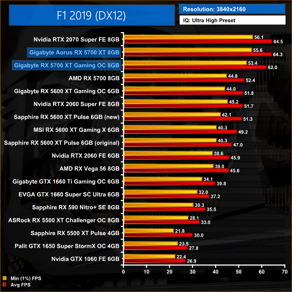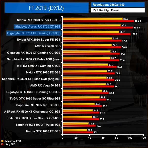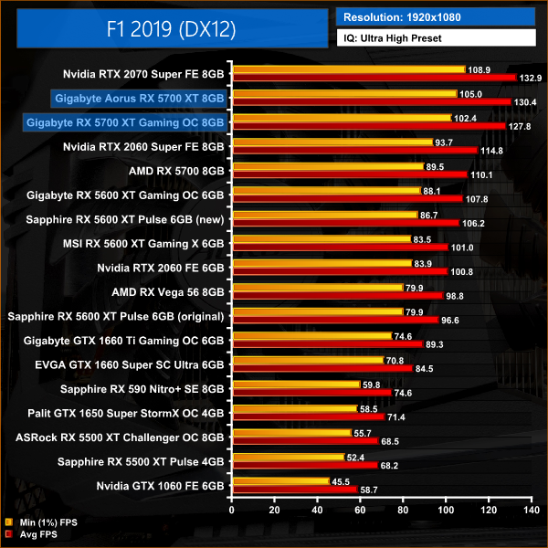 Playing F1 2019 at 1080p doesn't show much of a difference between the two 5700 XT cards, as there is barely a 2% difference between the Aorus and Gaming OC.