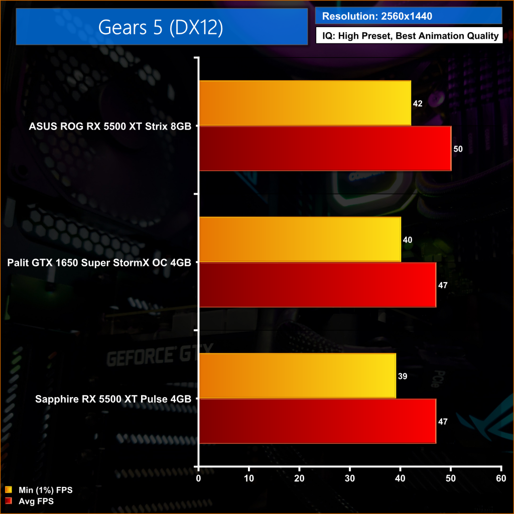 Gears 5 introduces a question mark around the 4GB GPUs, with the 8GB 5500 XT leading its 4GB counterpart by 3% at 1080p. Hardly a lot, but a little higher than a number of the other titles we have tested so far. Compared to GTX 1650 Super, however, the 8GB 5500 XT takes a 7% lead.