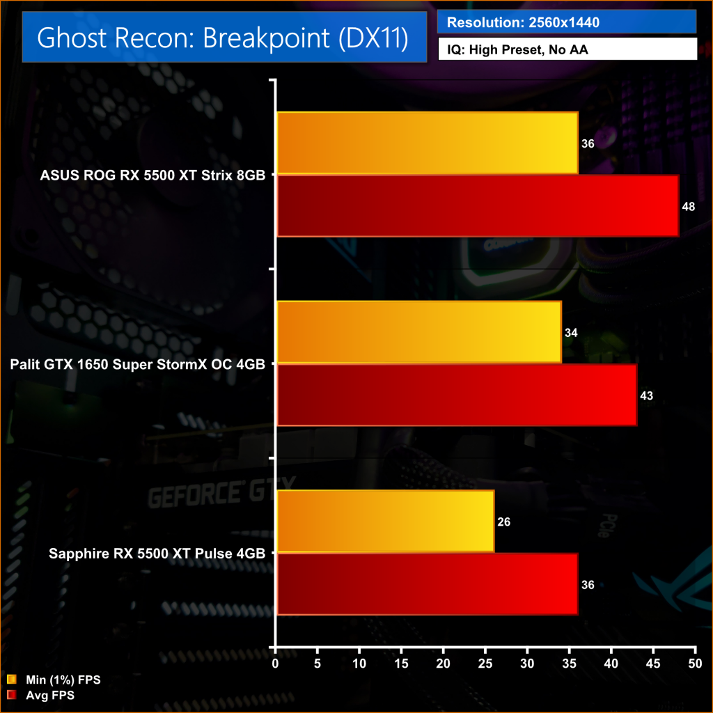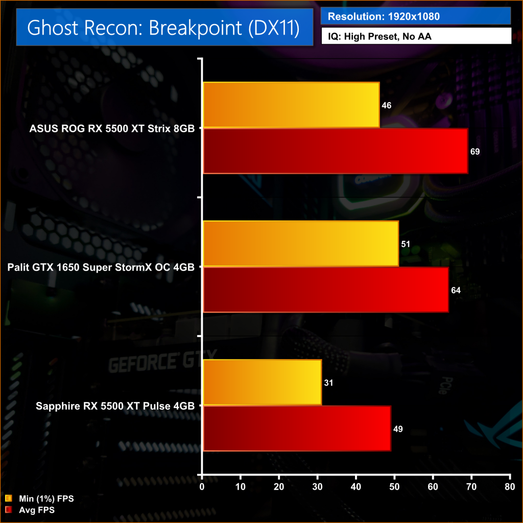Things get very interesting in Ghost Recon Breakpoint. Despite the 4GB GTX 1650 Super doing well at 1080p – granted, the 8GB 5500 XT is still 7% faster – we see significant performance drop off from the 4GB 5500 XT, as it comes in almost 25% slower than the 1650 Super, with pretty poor 1% low performance. It seems the game definitely wants more than 4GB VRAM, but the Navi GPU pays a significantly higher price for this than its Nvidia counterpart.