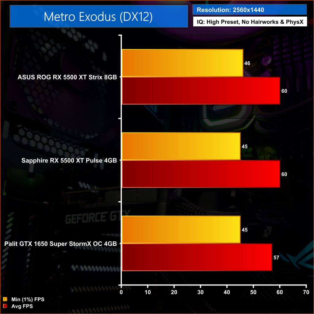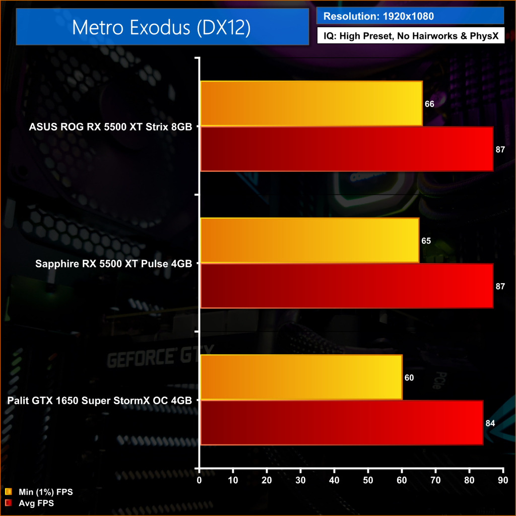 Metro Exodus puts us back on trend, with not a whole lot between all three GPUs. There is a slight preference for the AMD GPUs based on our testing, but we're talking less than a 5% difference. Memory is clearly not a factor either, as both 4GB and 8GB 5500 XT cards perform identically here.