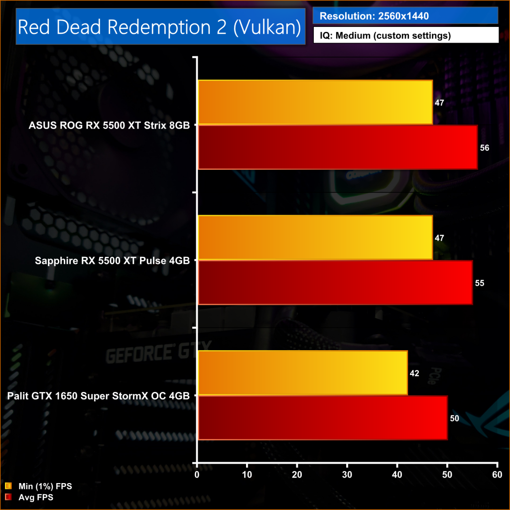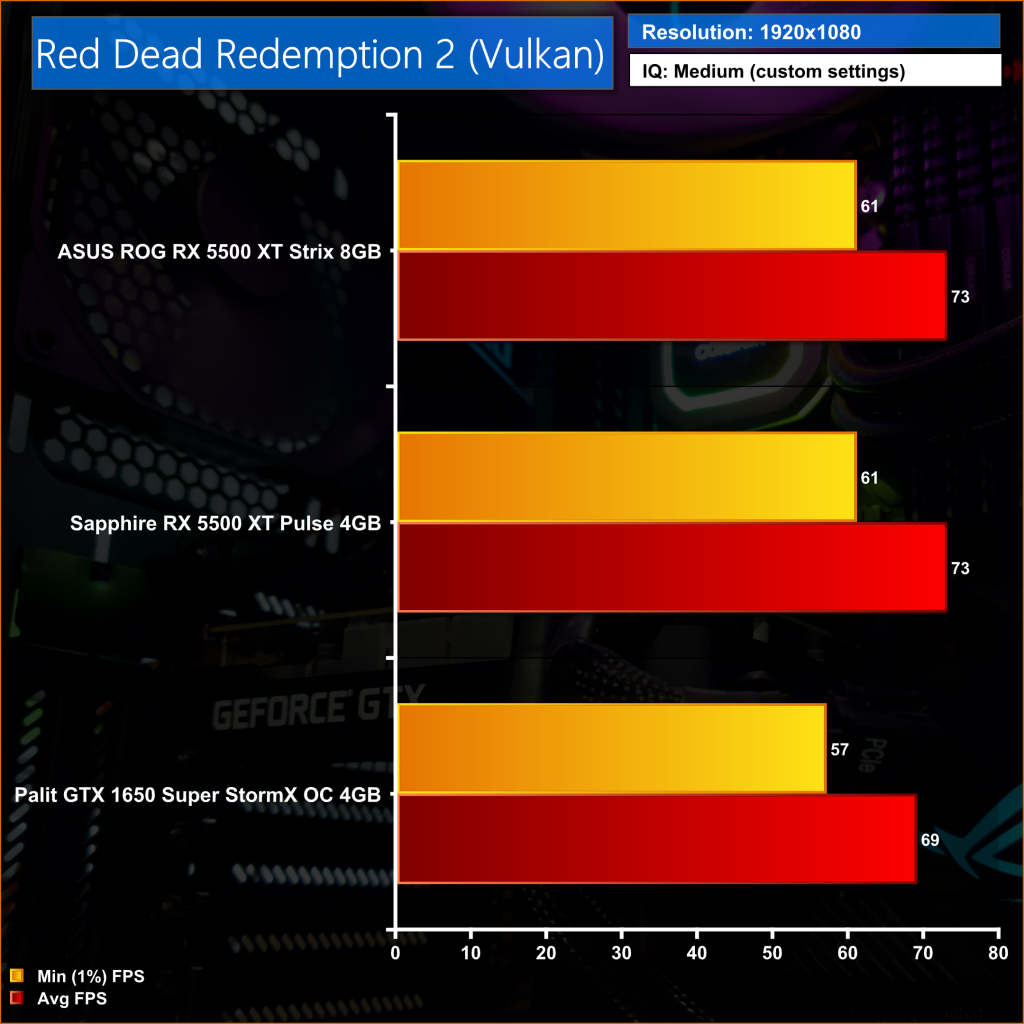 Read Dead Redemption 2 produces results very similar to Metro Exodus. At 1080p we are not memory limited, at least not using Medium settings as we are here, yet we can observe a very small preference for AMD hardware, with both 5500 XTs beating out 1650 Super by just under 6%.