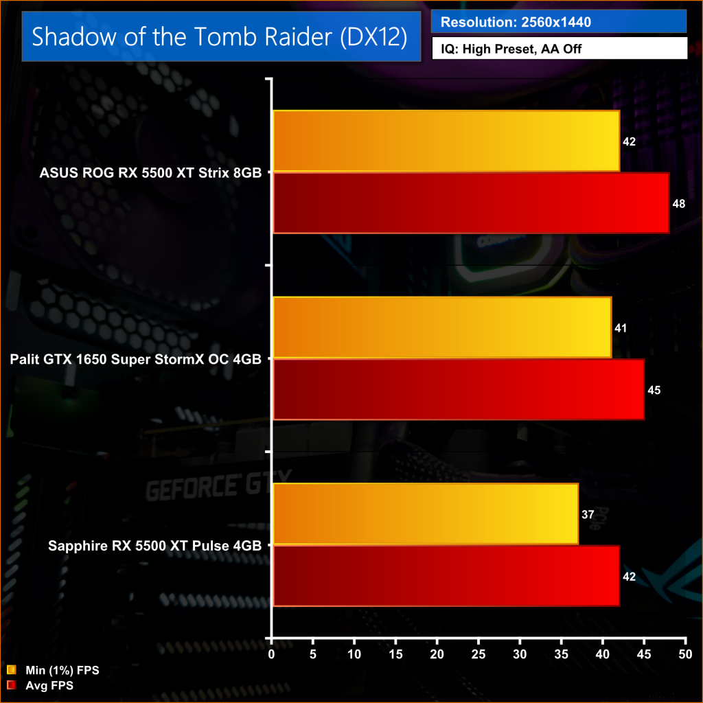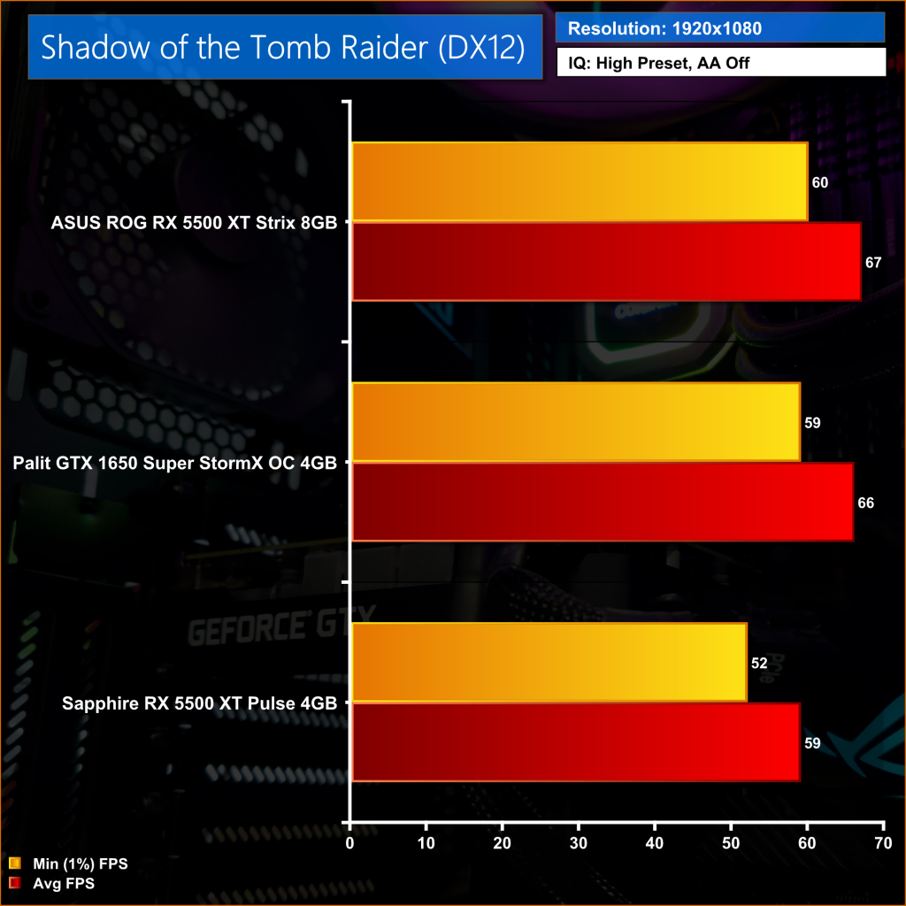 As for Shadow of the Tomb Raider, this game joins the likes of Breakpoint and Shadow of War, by showing us the 4GB 5500 XT suffering due to its memory limits, while the 4GB 1650 Super does noticeably better. The 8GB 5500 XT, for instance, is 13% faster than the 4GB model, yet 1650 Super is still 12% faster in turn. It appears to be another case where the Nvidia GPU does significantly better, despite sharing the 4GB frame-buffer.