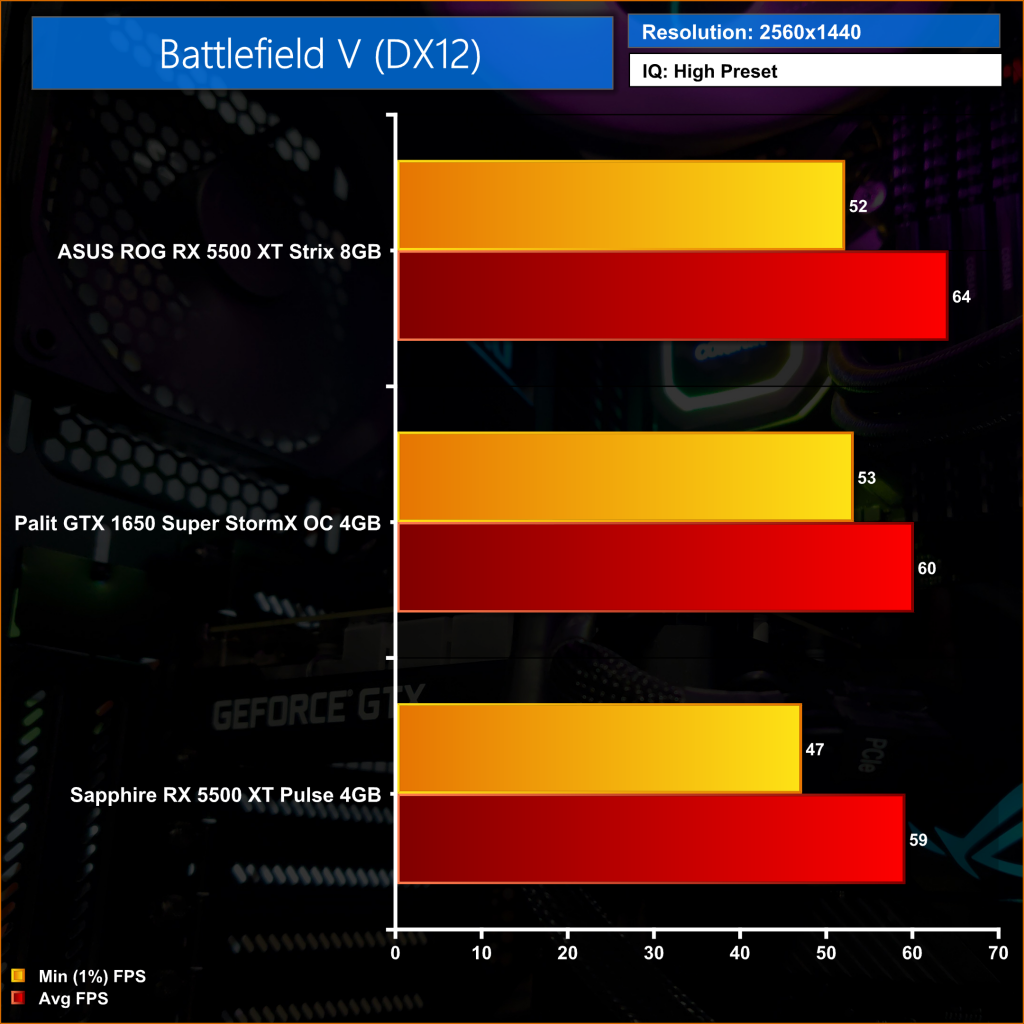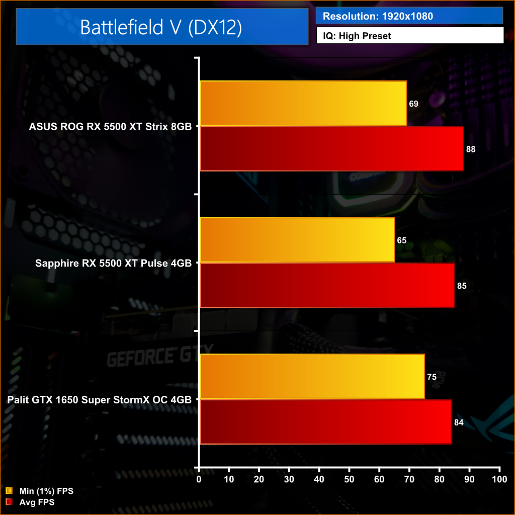 Starting things off with Battlefield V, I've been testing this game for almost two years now but it is still capable of surprises. Testing using the High preset, one step down from Ultra settings, average frame rates for all three cards are very close at 1080p, with the 8GB 5500 XT edging out the other two GPUs by just 3 or 4 FPS. Despite that, it is the 1650 Super which offers a smoother overall experience as its 1% lows are in the mid-70s, whereas the AMD GPUs drop down to the mid-to-high 60s.