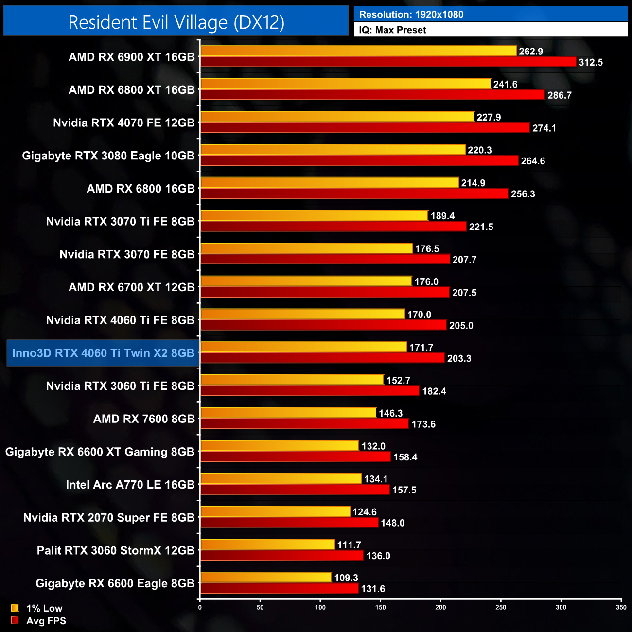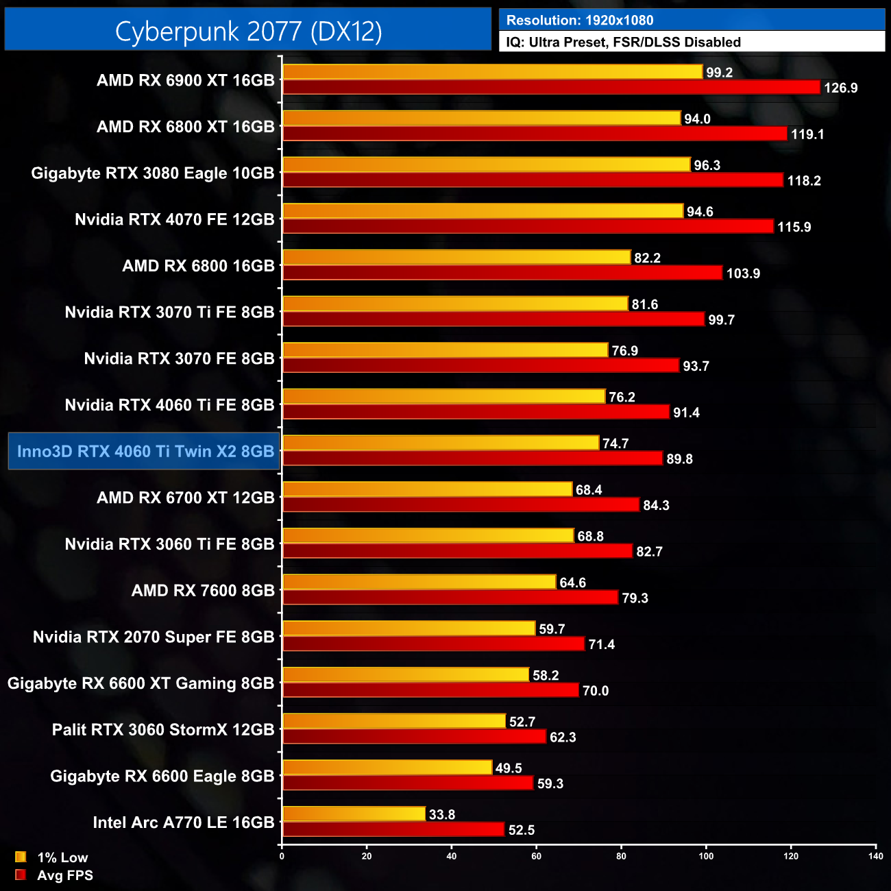 We don't test as many games in our AIB card reviews as we would in our day 1 launch articles for reasons that should be pretty clear from viewing the above charts – the real-world gaming difference between two of the same GPUs is essentially nil. Our figures do show incredibly minor differences, with the Inno3D 1-2% behind the Founders Edition, but that's hardly even worth mentioning. In the real world, there'd be no telling these two cards apart based on gaming performance.