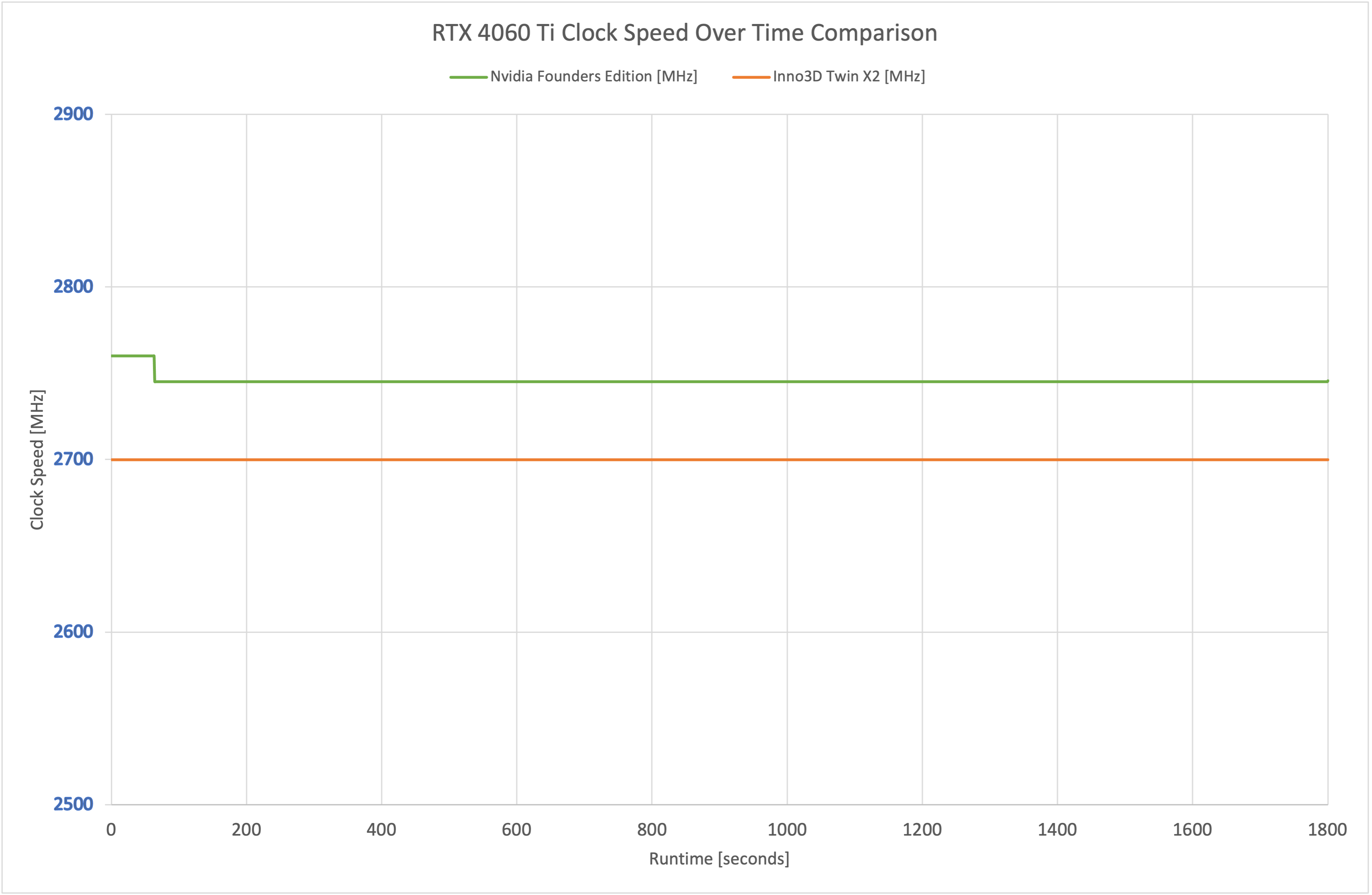 Interestingly, despite both the Twin X2 and Nvidia Founders Edition sharing the same 2535MHz rated boost clock, we did observe the Twin X2 running a fraction slower in our stress test. Over the thirty minute run, it averaged 2700MHz, compared to 2745MHz for the Nvidia FE.