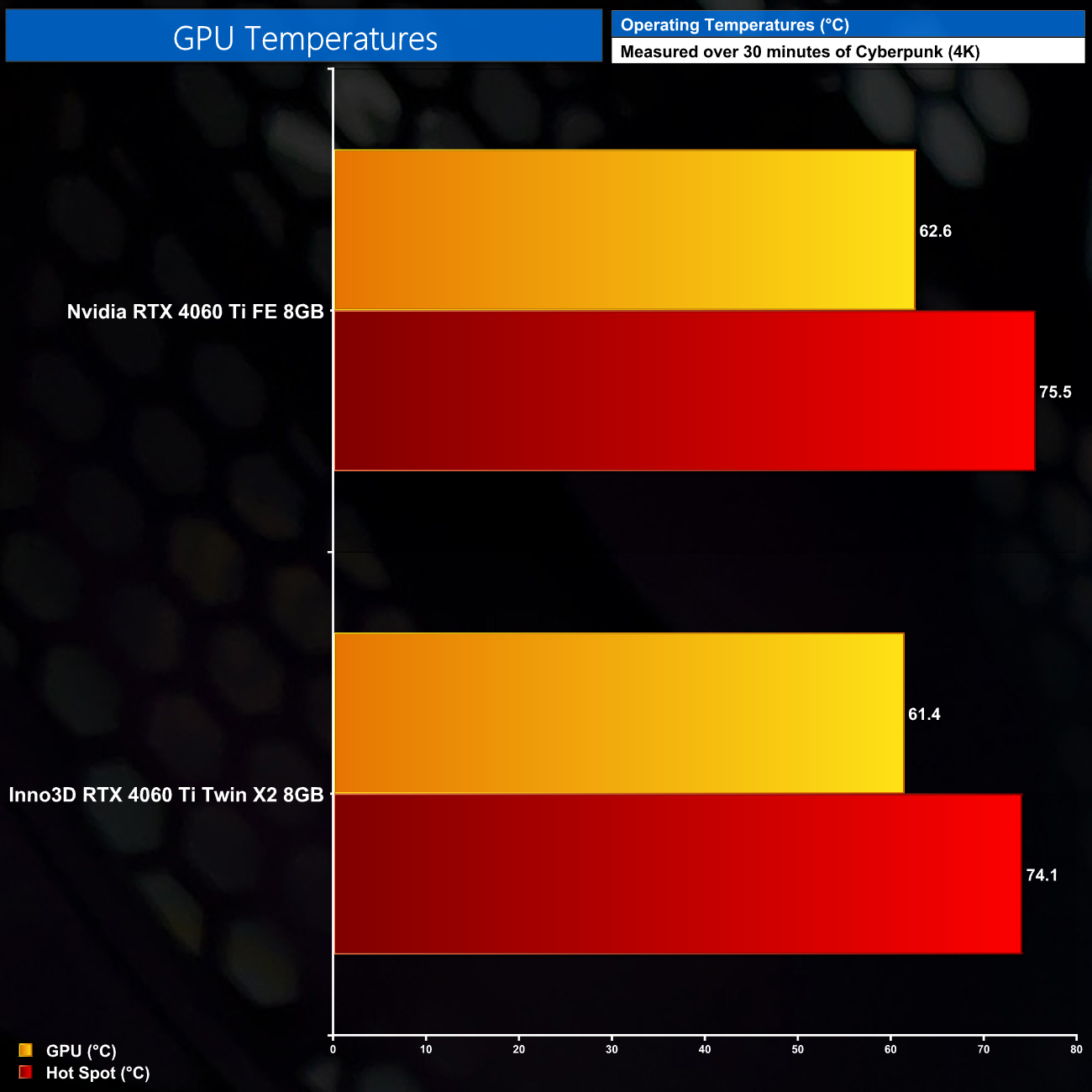 As for thermals, in the out of the box state, there is very little to split between the Twin X2 and the Founders Edition. The Inno3D came in with a peak of 61.4C on the GPU, and 74.1C on the hot spot, making it roughly 1C cooler than Nvidia's own design. There's very little in it though, so let's see if noise levels will separate these two cards…