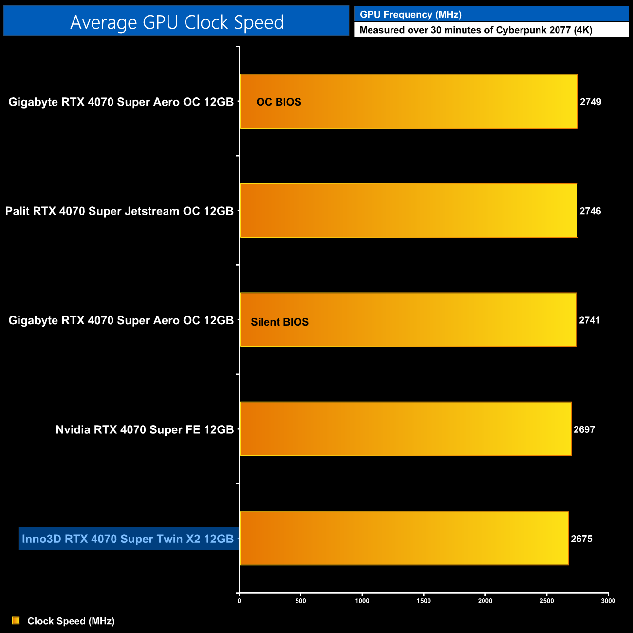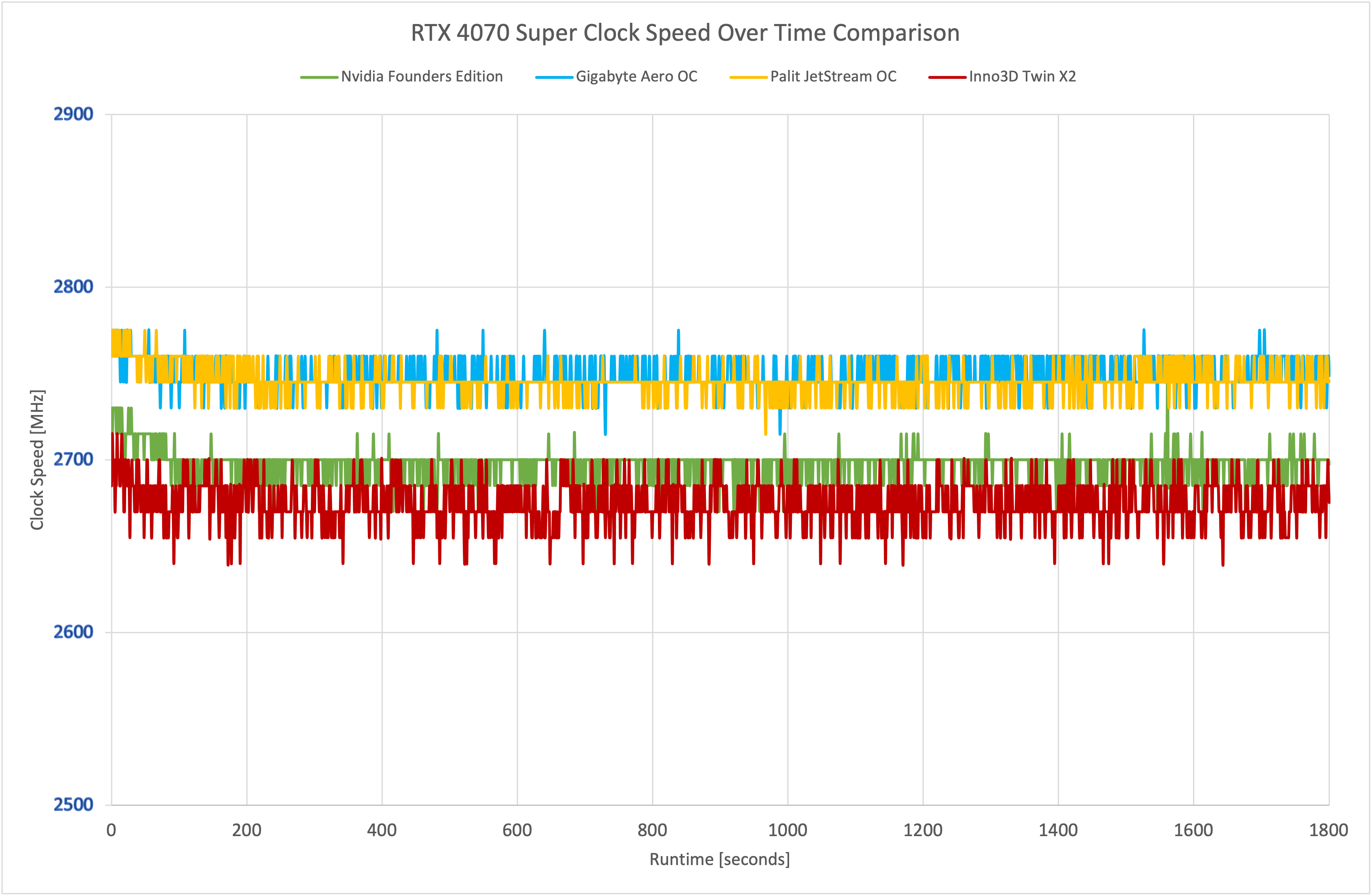 As expected based on our game benchmarks, there is only a negligible 22MHz clock speed difference between the Twin X2 and the Founders Edition, while the Inno3D is about 65-75MHz slower than the likes of the Aero OC or Palit JetStream OC.