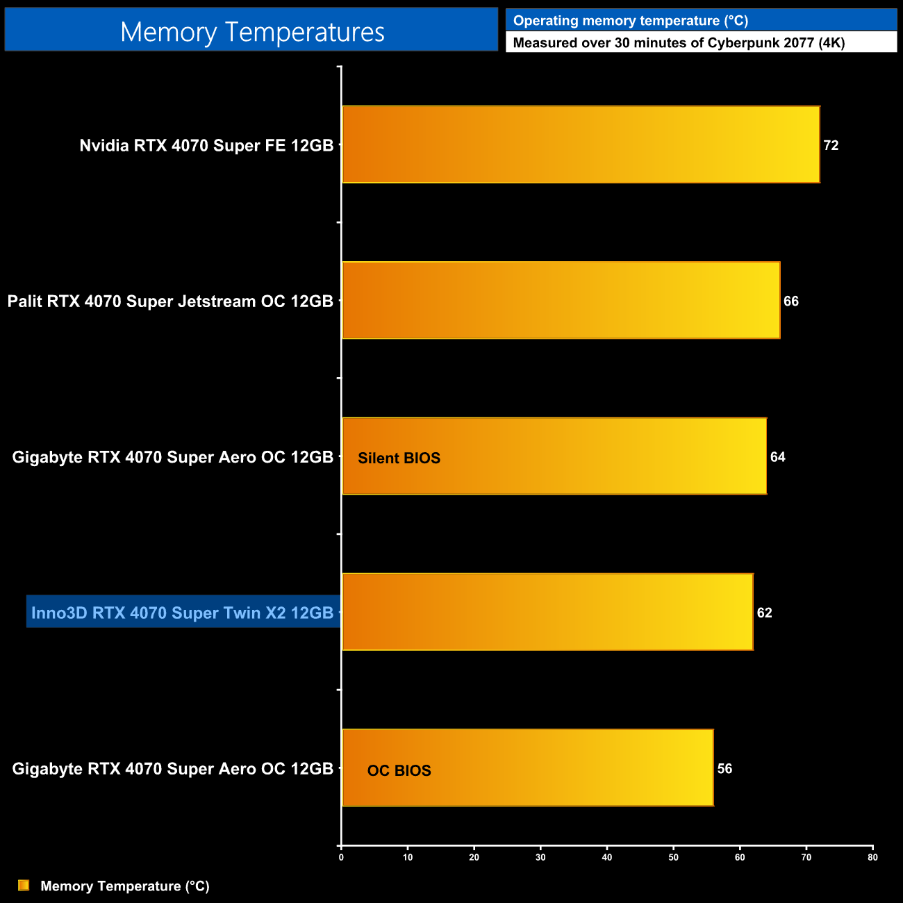 For our memory temperature testing, we measure the peak memory temperature under load. A reading under load comes from running Cyberpunk 2077 for 30 minutes.