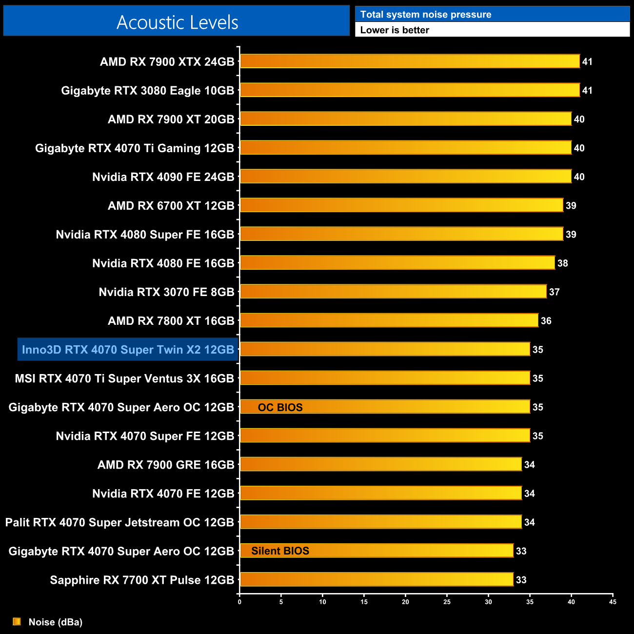 We take our noise measurements with the sound meter positioned 1 foot from the graphics card. I measured the noise floor to be 32 dBA, thus anything above this level can be attributed to the graphics cards. The power supply is passive for the entire power output range we tested all graphics cards in, while all CPU and system fans were disabled. A reading under load comes from running Cyberpunk 2077 for 30 minutes.