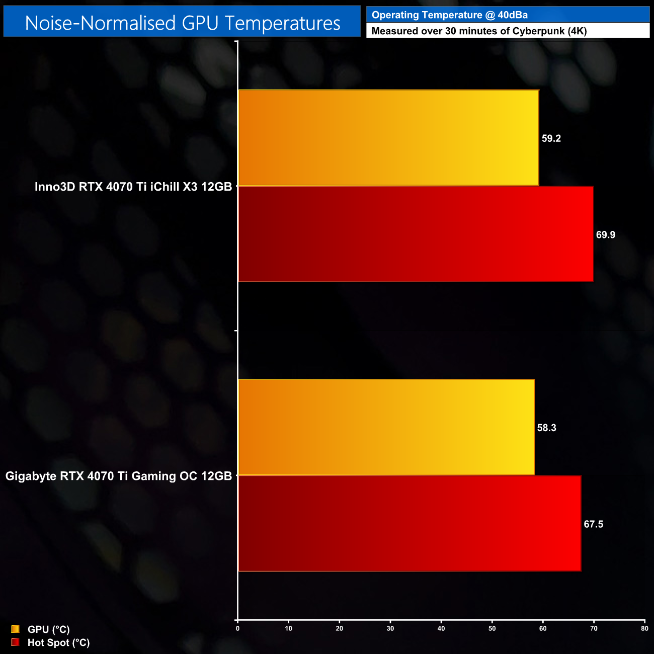 There's very little to split between the iChill X3 and Gaming OC in terms of noise-normalised GPU temperatures. The iChill X3 does run fractionally hotter, but only by a couple degrees when looking at the Hot Spot temperature. Both are clearly excellent cooler designs.