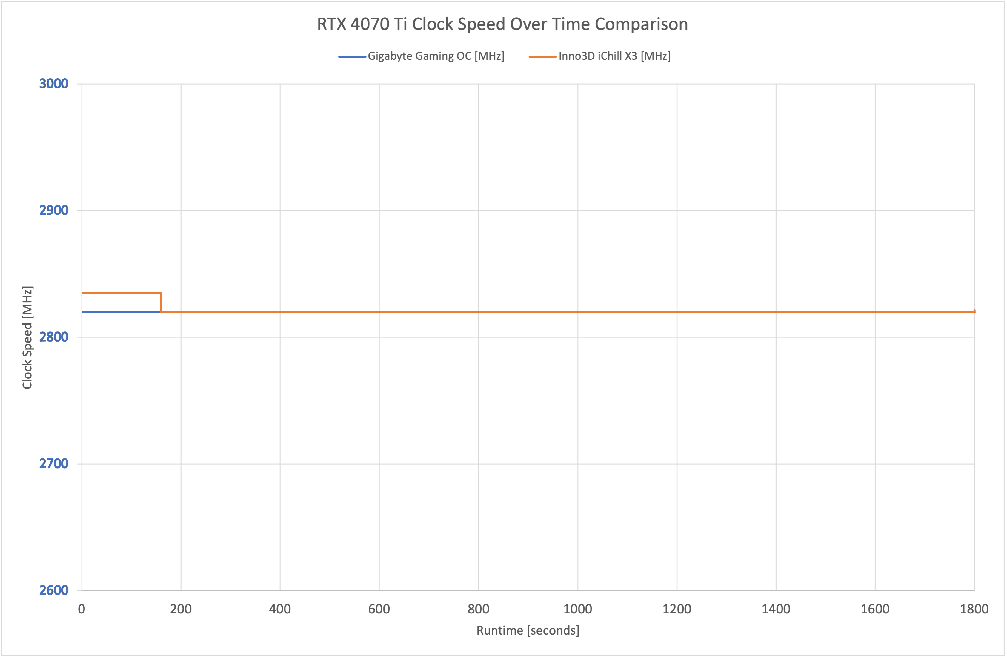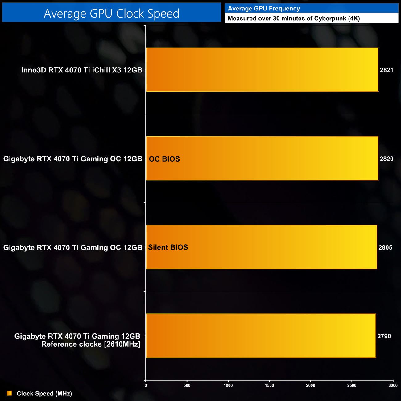 In terms of overall clock speed, the iChill X3 averaged 2821MHz over our thirty minute stress test, just a 1MHz difference compared to the Gigabyte Gaming OC. We found that the iChill initially boosted up to 2835MHz for the first 90 seconds or so, before dropping down to 2820MHz where it remained for the rest of our stress test.