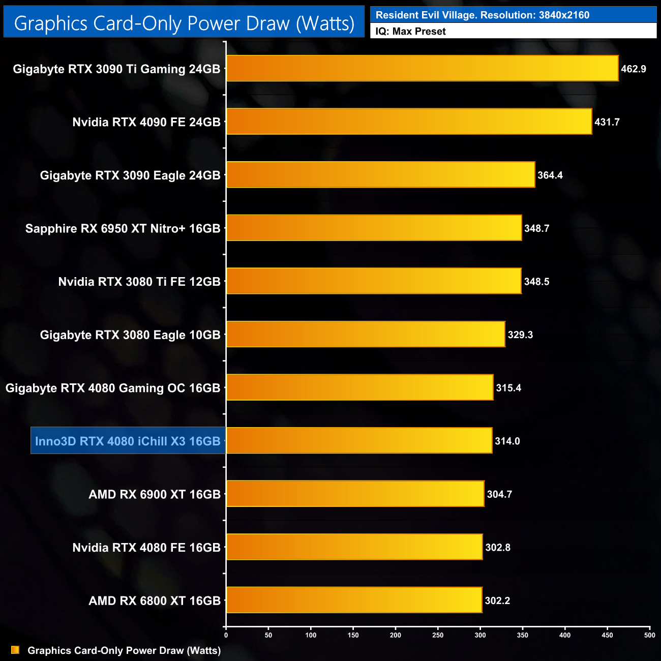 As for power draw, it’s important to note that the iChill X3 has not increased the power limit of the card, so it’s still rated for 320W like the Founders Edition. In practice, we saw it draw 314W in Resident Evil Village at 4K, so very similar to the Gigabyte Gaming OC