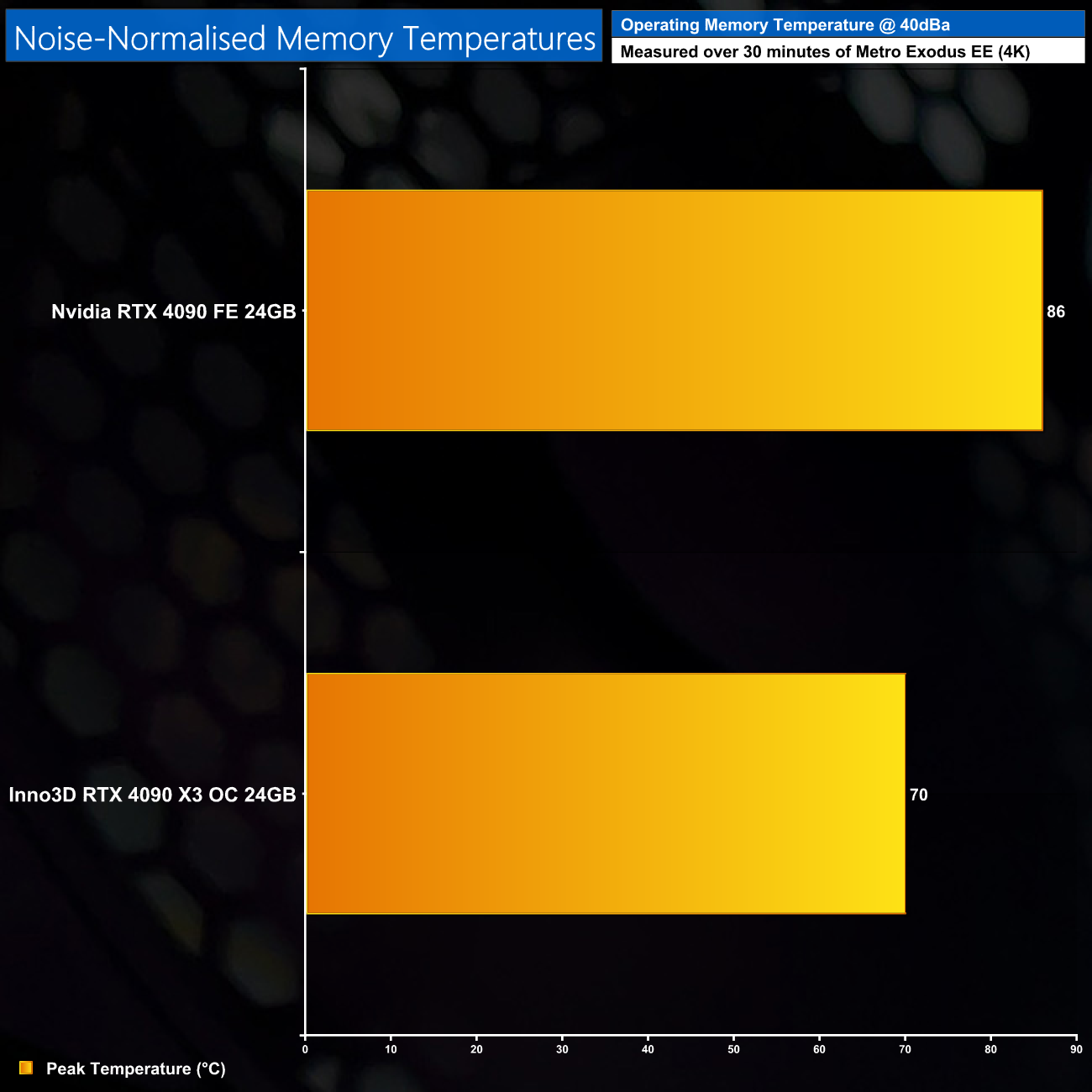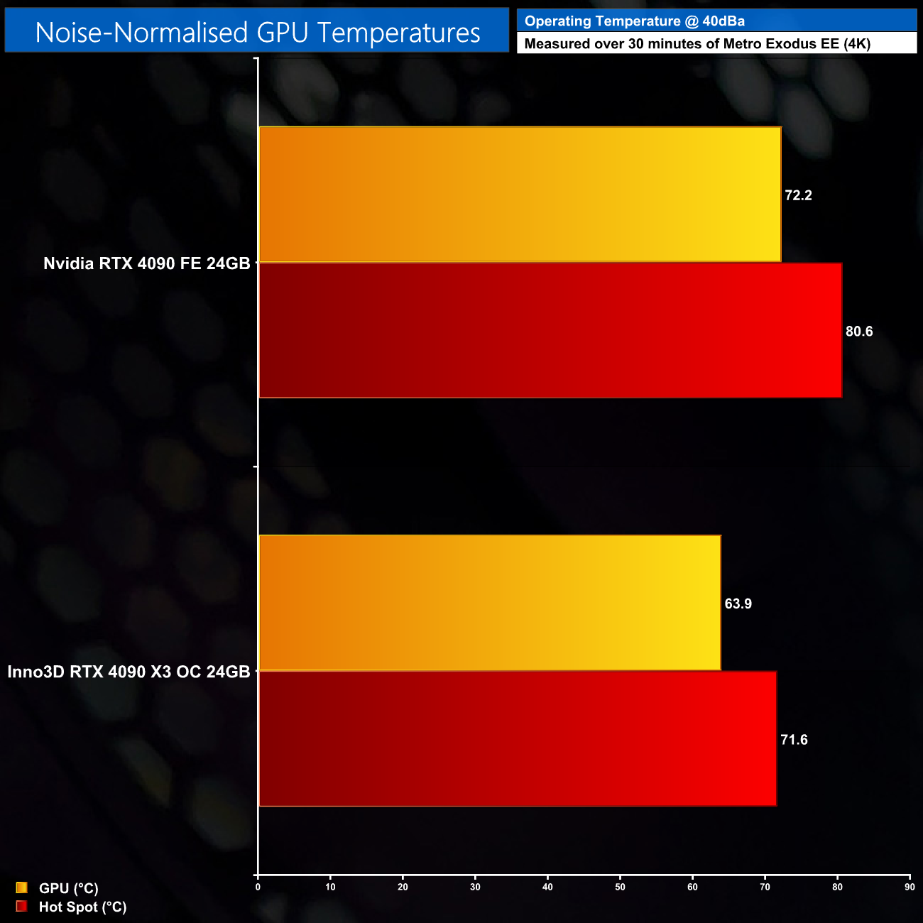 Following on from our stock thermal and acoustic testing, here we re-test the operating temperature of the GPU, but with noise levels normalised to 40dBa. This allows us to measure the efficiency of the overall cooling solution as varying noise levels as a result of more aggressive fan curves are no longer a factor.