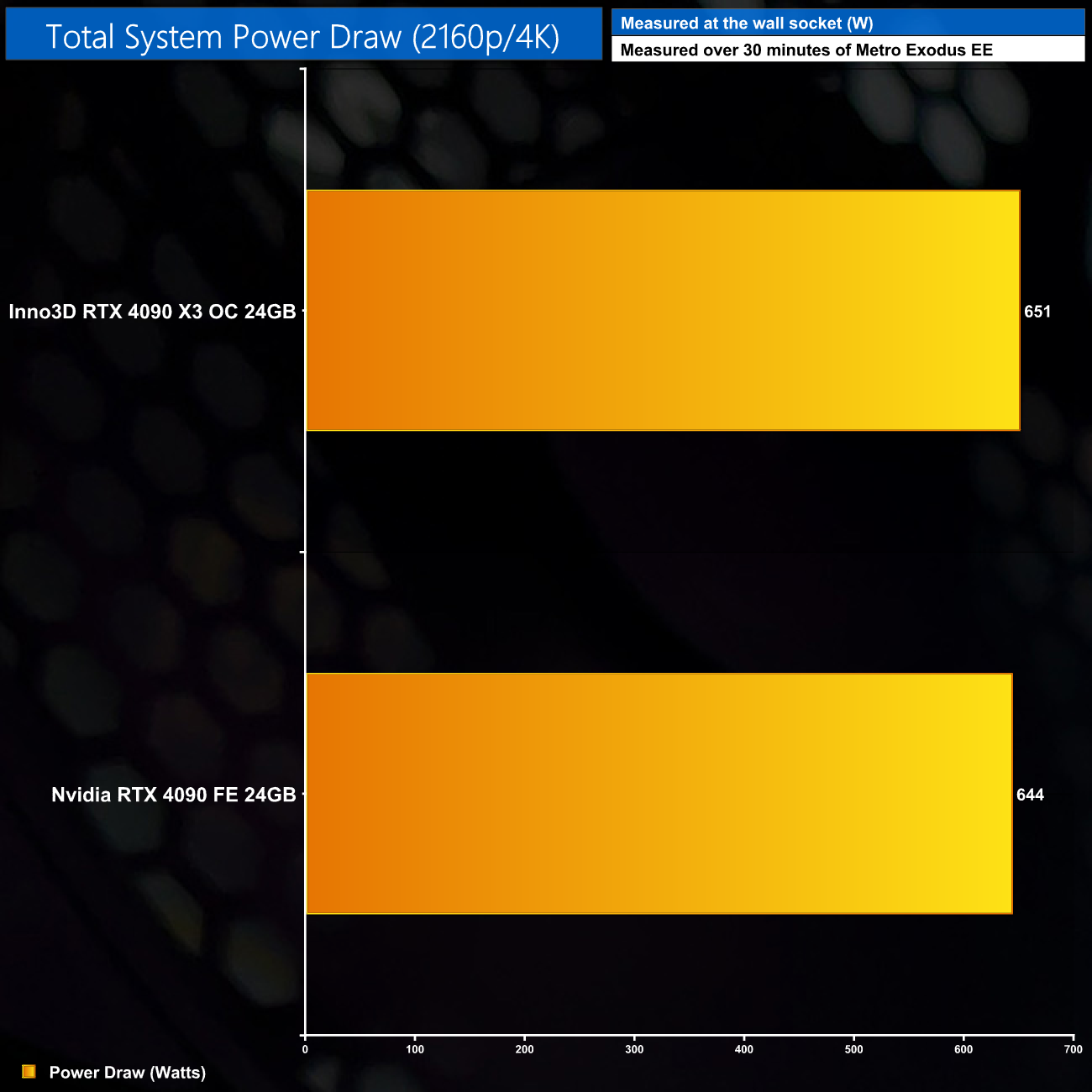 We can see a similar thing when looking at total system power draw. The X3 OC saw the system pull 651 Watts, compared to 644 Watts for the Founders. An 850W PSU is recommended at minimum.