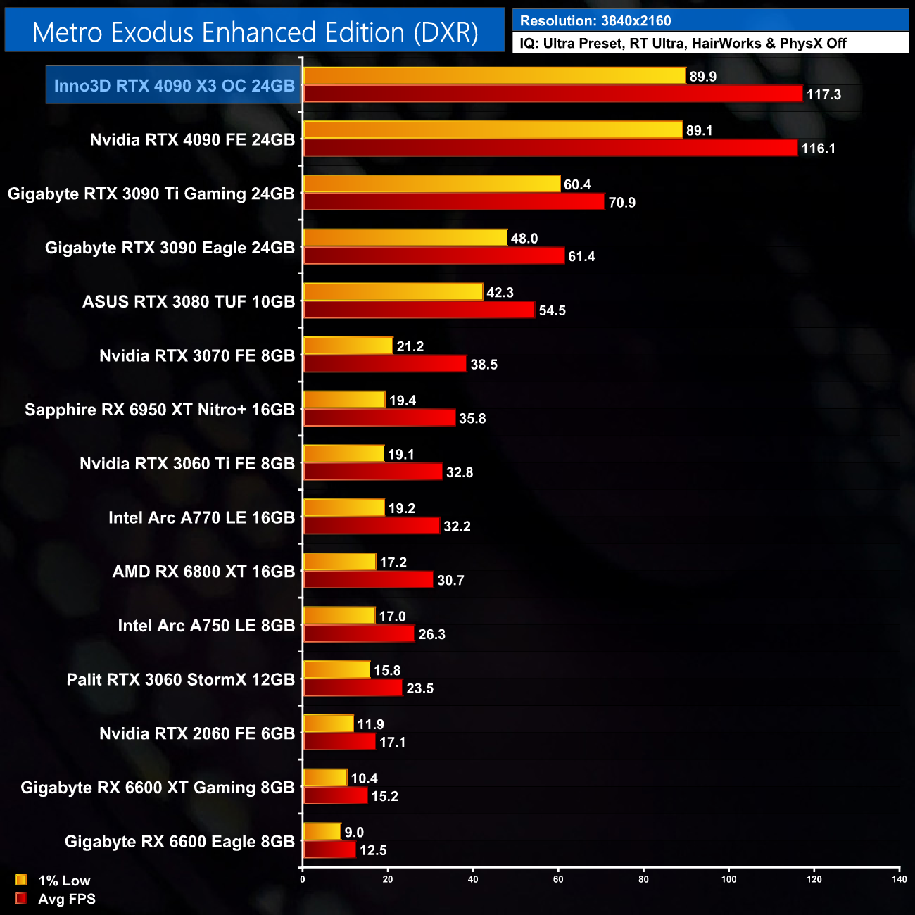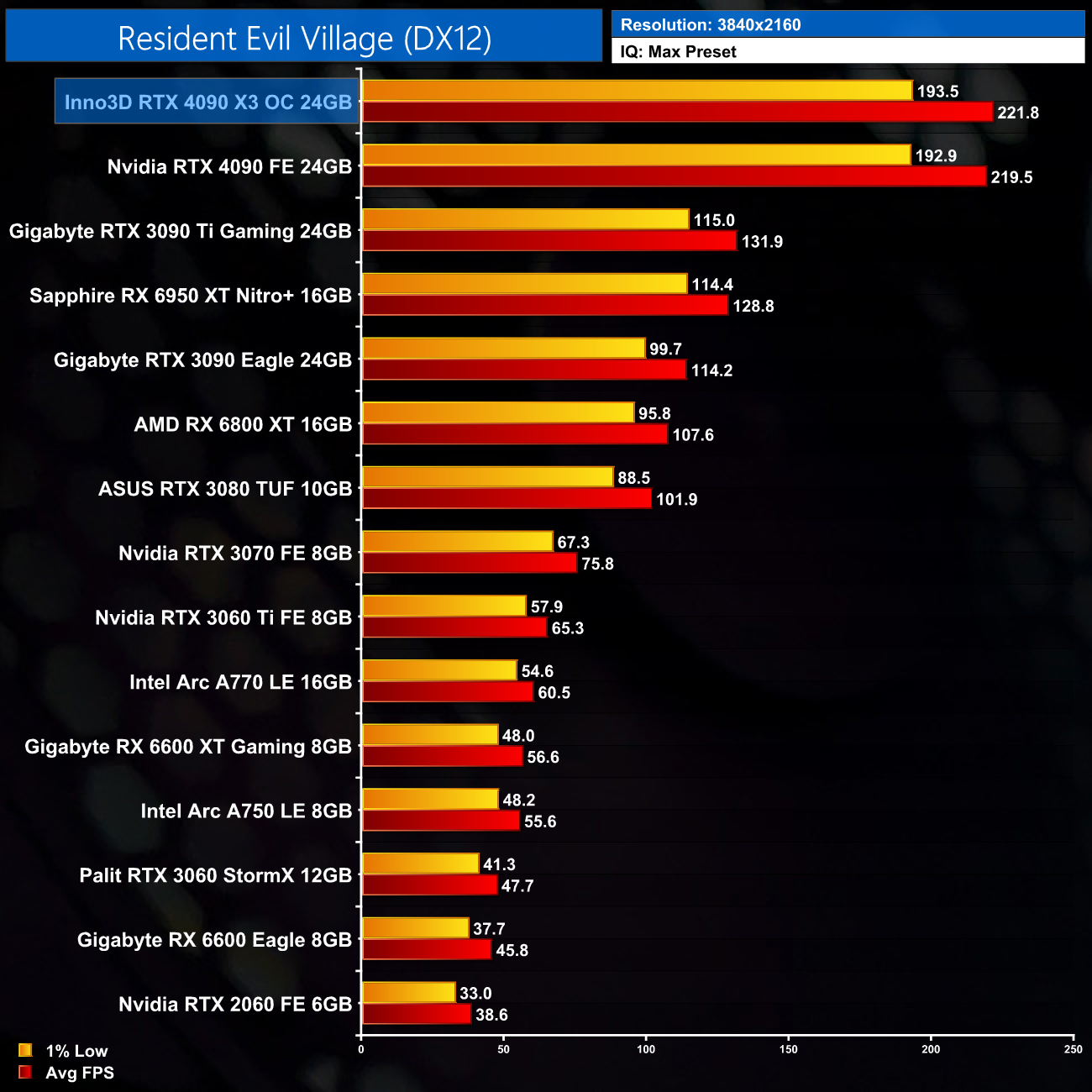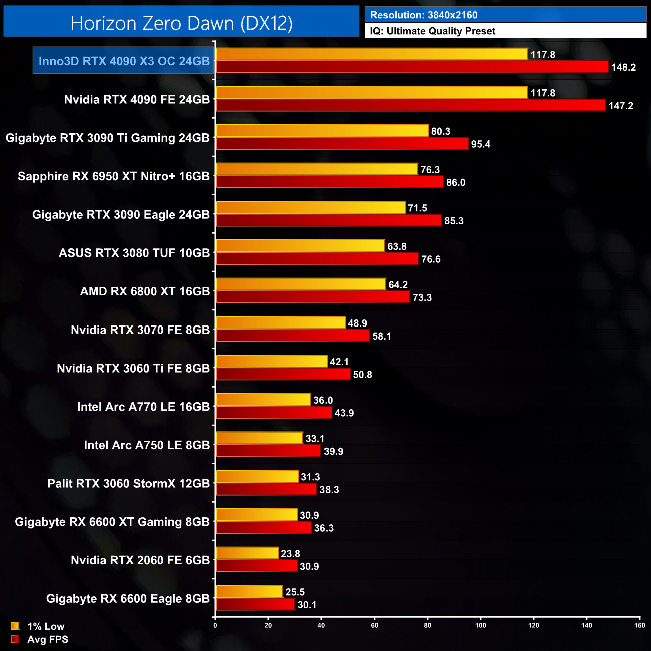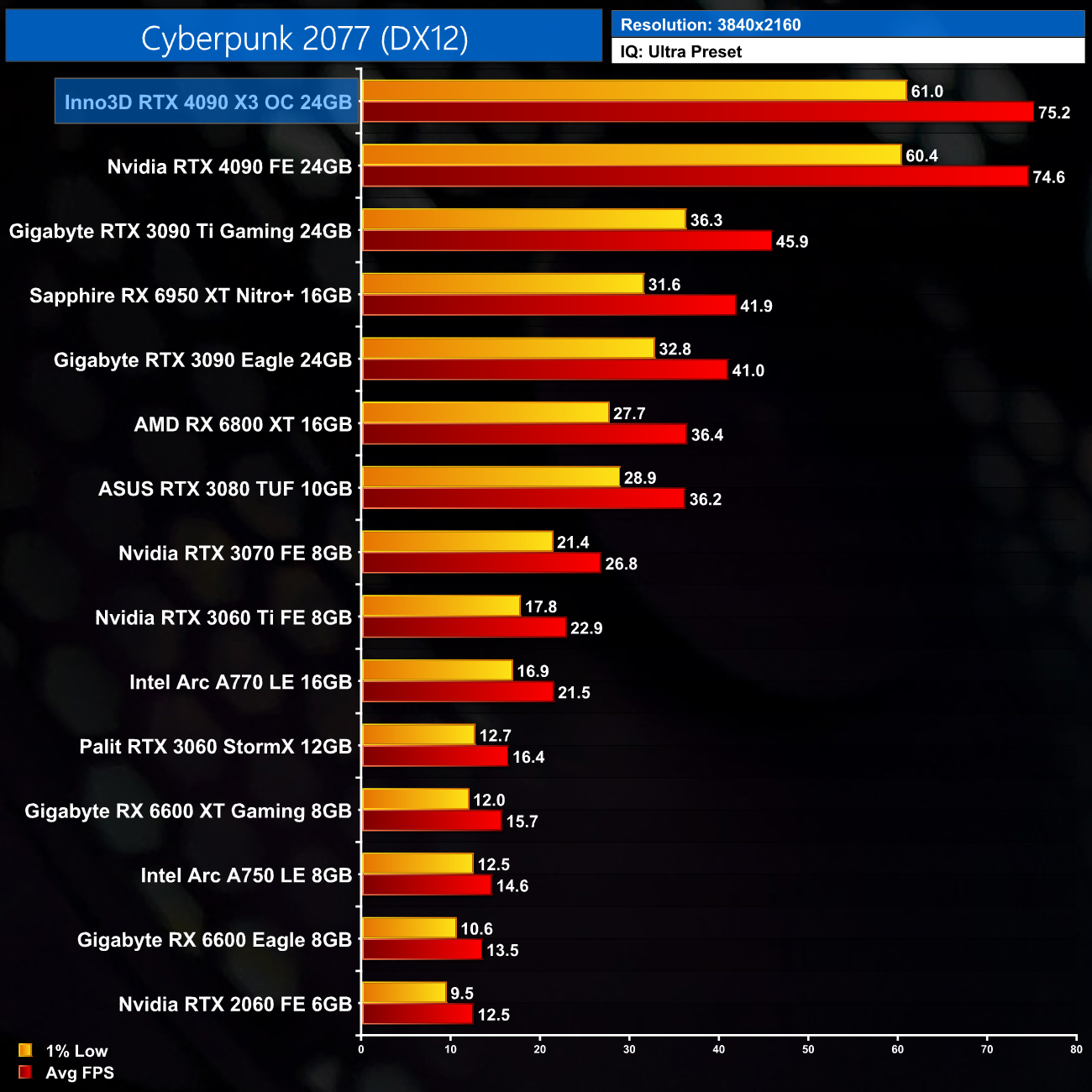 Game benchmarks aren't a huge focus for us in these AIB reviews, for reasons that become clear when looking at the above charts. In a nutshell, the Inno3D RTX 4090 X3 OC is basically as fast as the Founders Edition, offering tiny – circa 1% – gains over the FE, and in some cases even less than that.