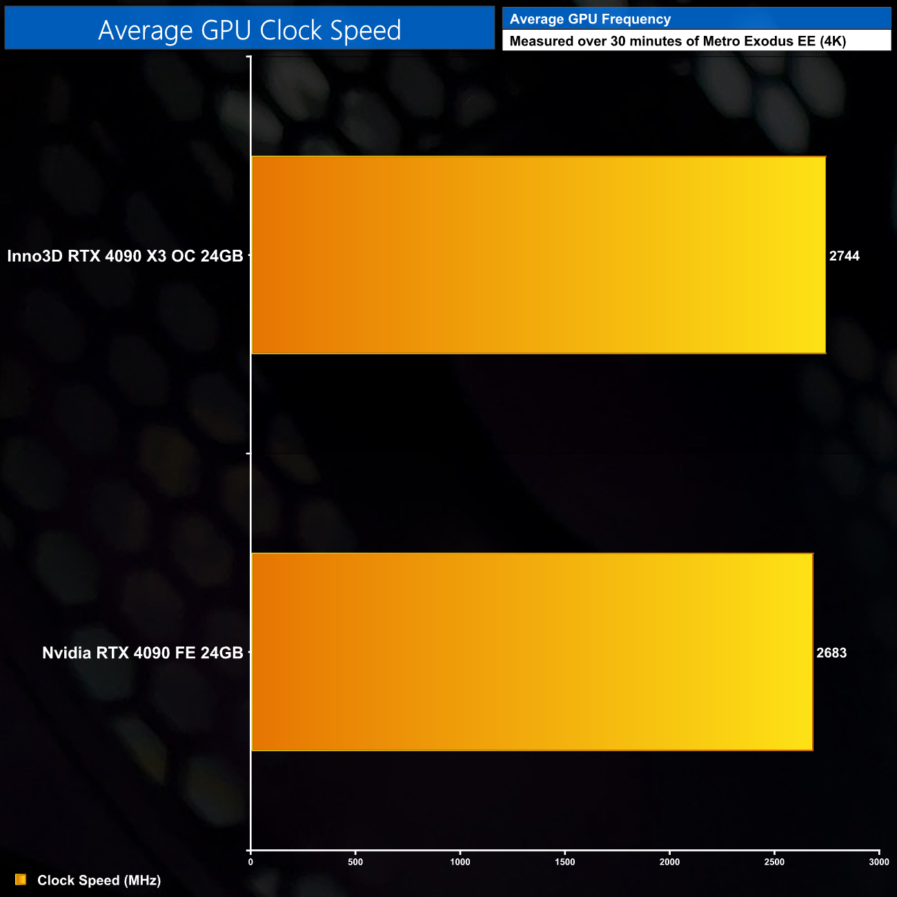 Here we present the average clock speed for each graphics card while running Metro Exodus Enhanced Edition for 30 minutes. We use GPU-Z to record the GPU core frequency during gameplay. We calculate the average core frequency during the 30-minute run to present here.