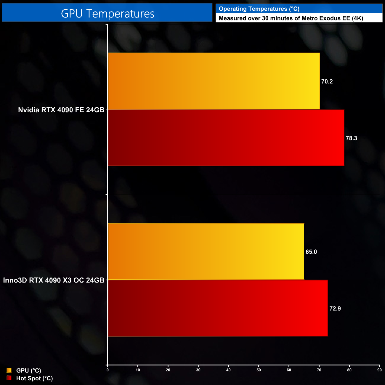For our temperature testing, we measure the peak GPU core temperature under load. A reading under load comes from running Metro Exodus Enhanced Edition for 30 minutes.