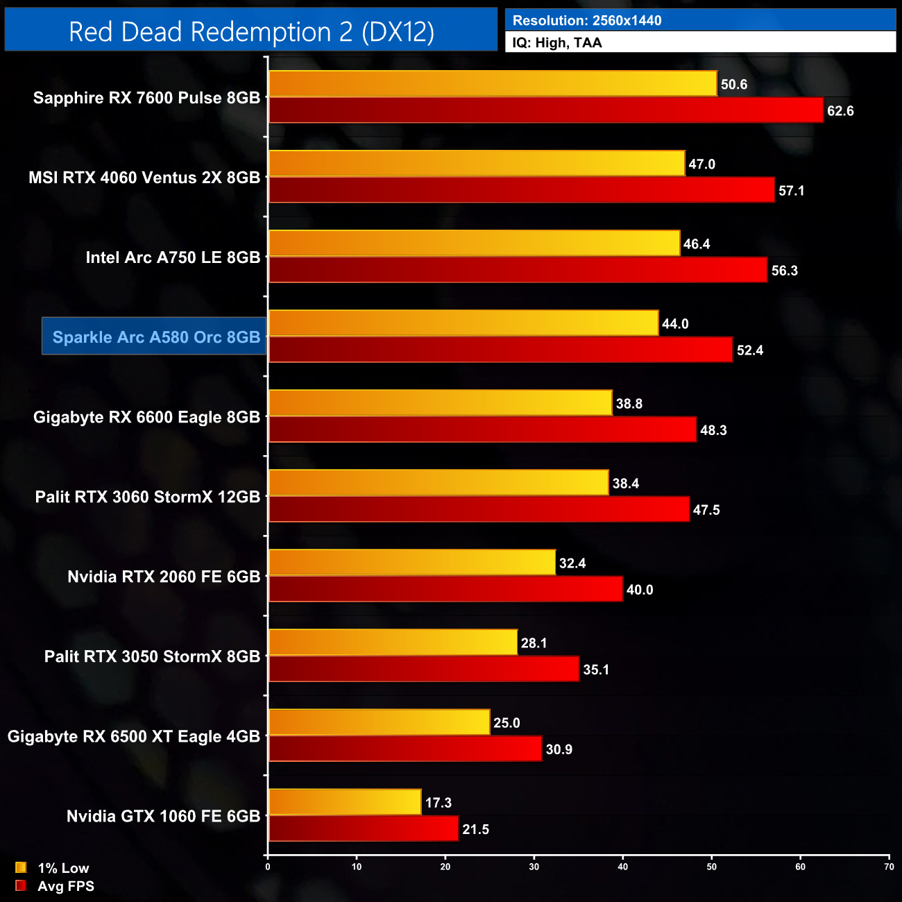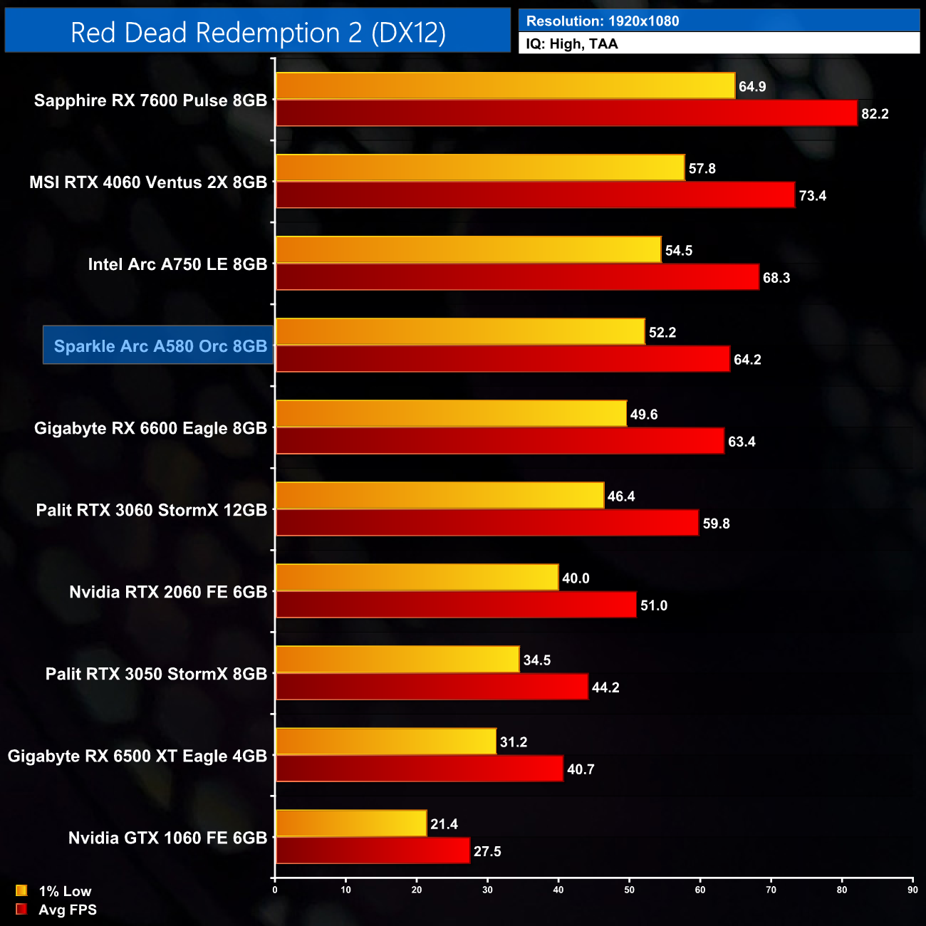 We see similar scaling in Red Dead Redemption 2 as well, with the A580 coming in level with the RX 6600 but faster than even the RTX 3060 at 10800p, where it delivers 64FPS on average.