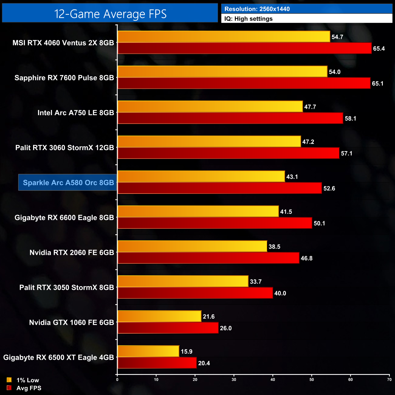 1440p is slightly more impressive for the A580, but not every game can run at a decent frame rate as we saw. Still, here it is now 5% faster than the RX 6600, while it comes in 8% slower than the RTX 3060, while it's 10% behind the A750.