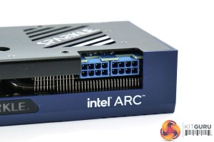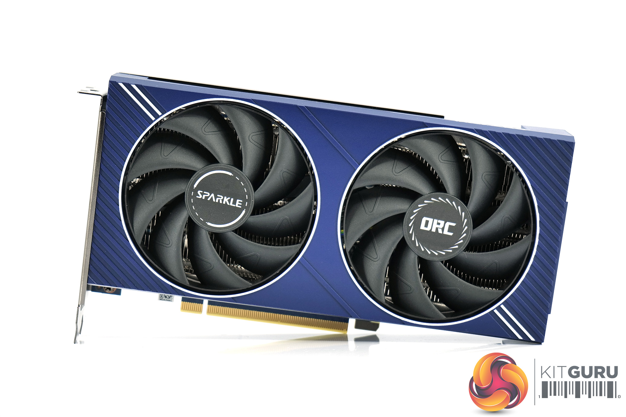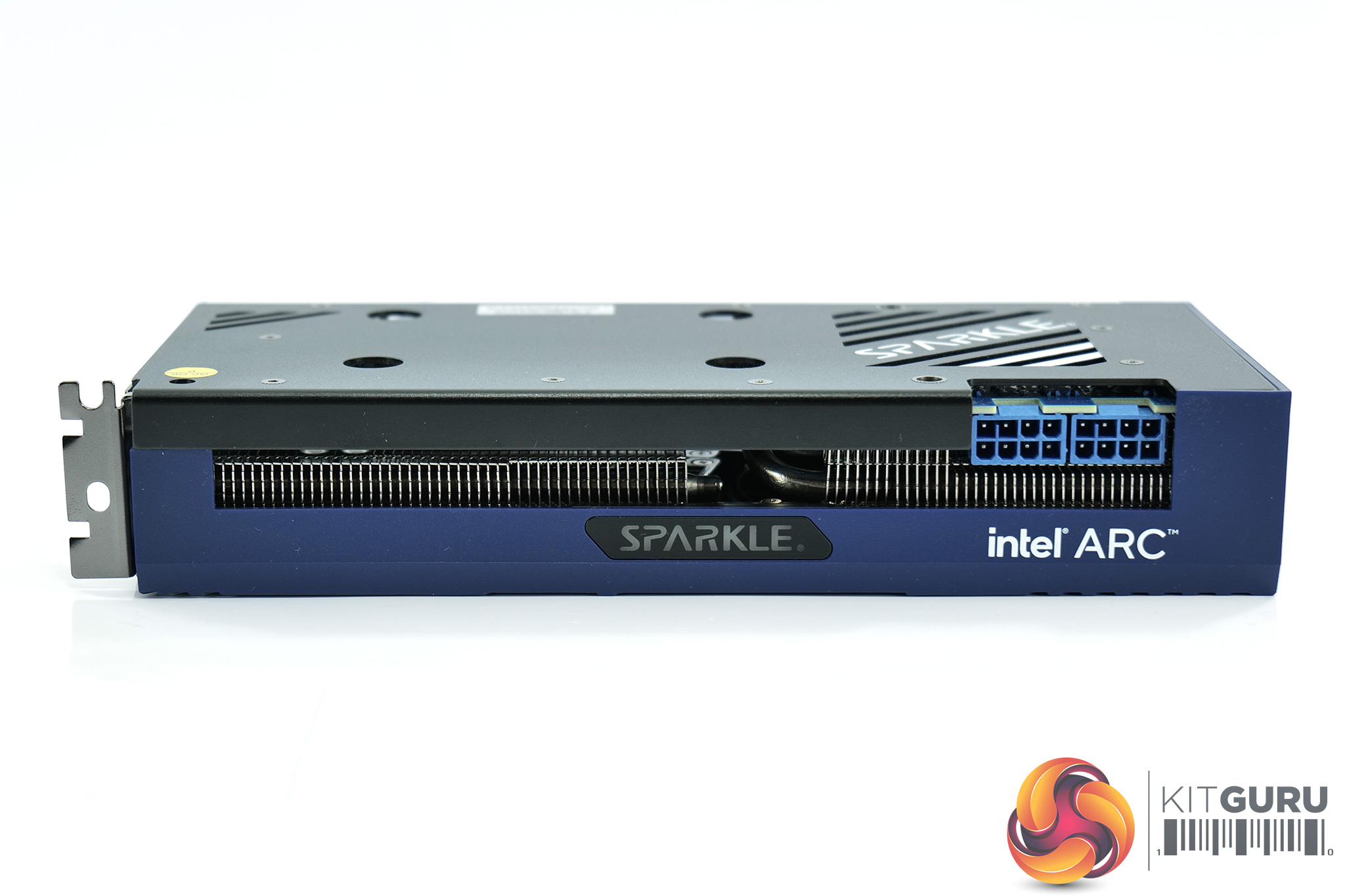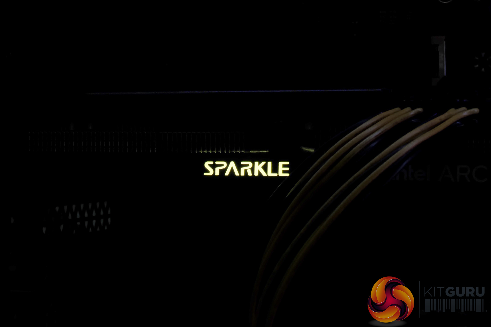The front side is home to the Sparkle logo (the only LED lighting zone on the card) and the Intel Arc branding printed in white text.