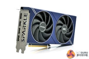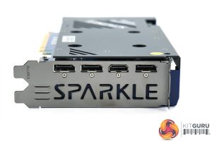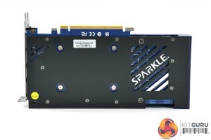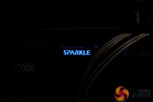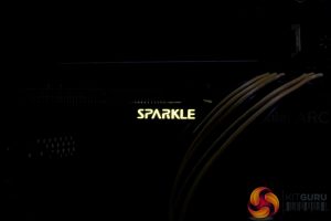 Back to that LED zone however, this uses what Sparkle describes as its patent-pending ThermalSync technology. Essentially the Sparkle logo changes colour based on the temperature of the GPU – it shows blue when idling, and changes to yellow when gaming (I saw it change when GPU temperatures exceeded 64C). I didn't see it change to red to indicate an even higher temperature, though of course this will depend on your case's airflow setup and ambient conditions.