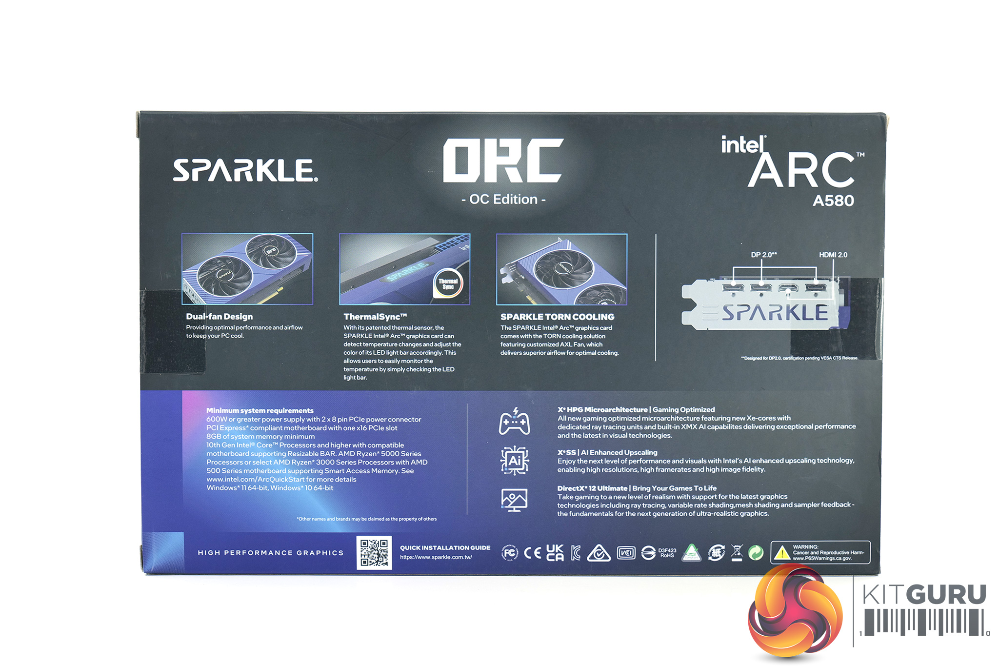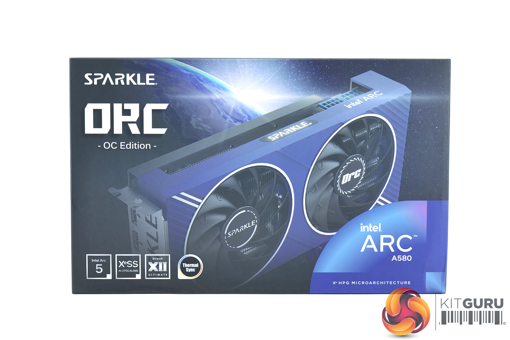 The Sparkle Arc A580 Orc ships in a dark blue box, with an image of the graphics card taking up most of the front. On the back, Sparkle highlights a few key features of the card and the cooler.