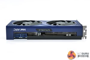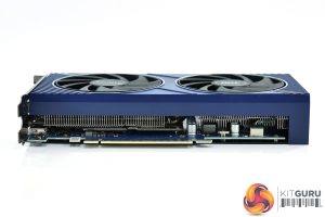 We can also see the full-length metal backplate with the blue PCB clearly visible underneath. Strangely, there are a few cut-outs in the backplate which would normally allow air to pass through the heatsink and out the back of the card… except the PCB is blocking the cut-outs anyway, so I'm not too sure what this achieves.