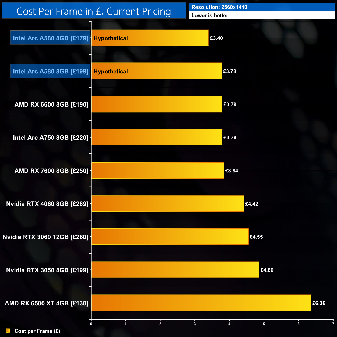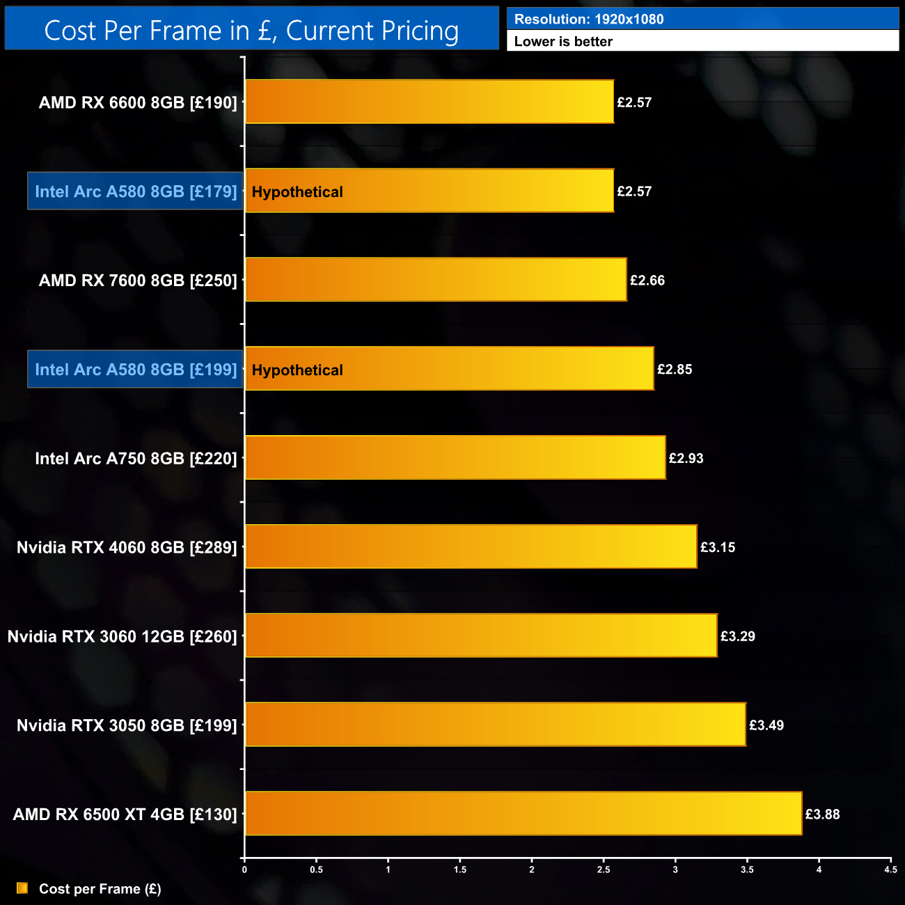 Still, at 1080p, even if the A580 hit the UK market at £179, it would only be on par with the RX 6600, which has fallen as low as £190 in recent months. If the A580 comes in at £199, even the RX 7600 would be better value.