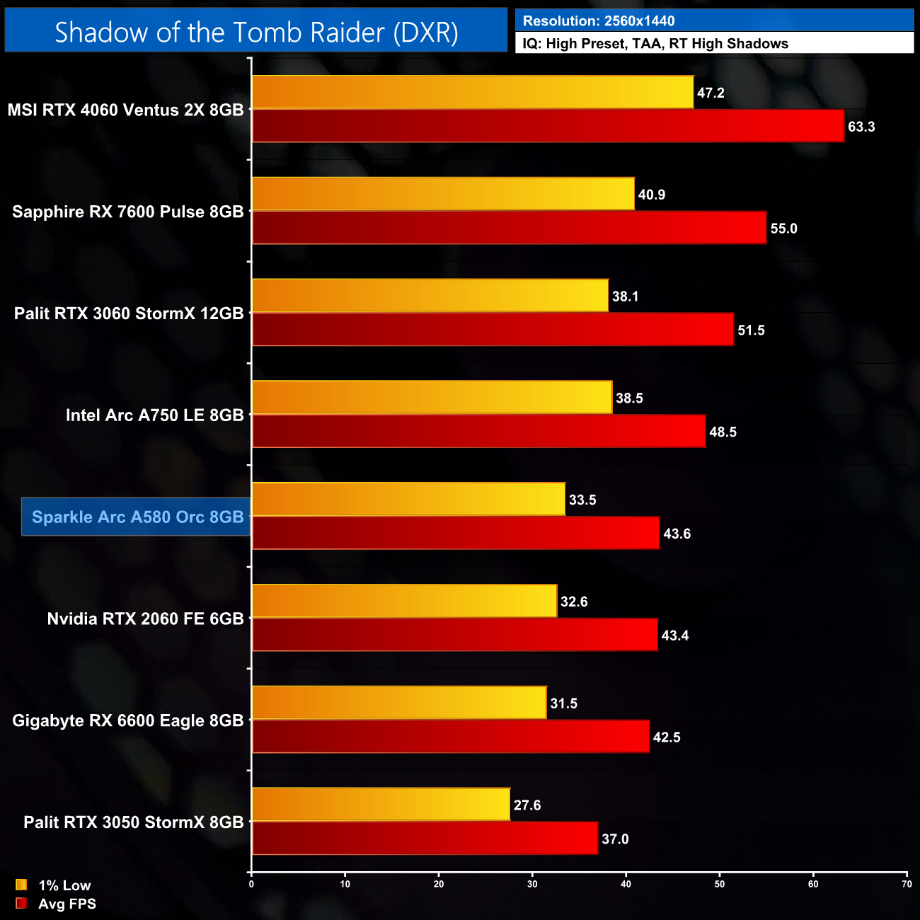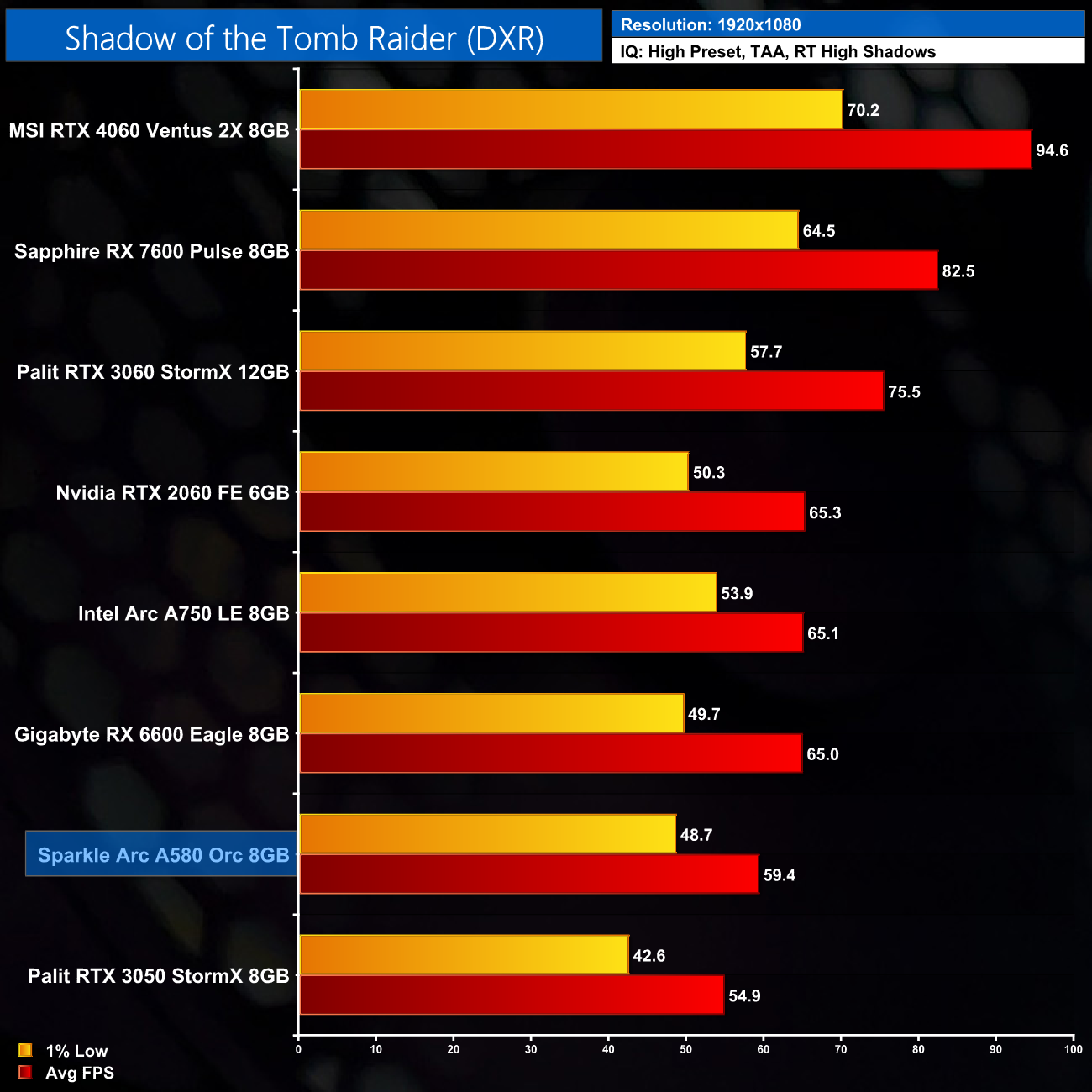 Lastly, we have Shadow of the Tomb Raider, which is limited to just RT Shadows. Here the A580 is just shy of 60FPS at 1080p, but it is slower than the RX 6600 by a 9% margin, and only 8% faster than the RTX 3050.